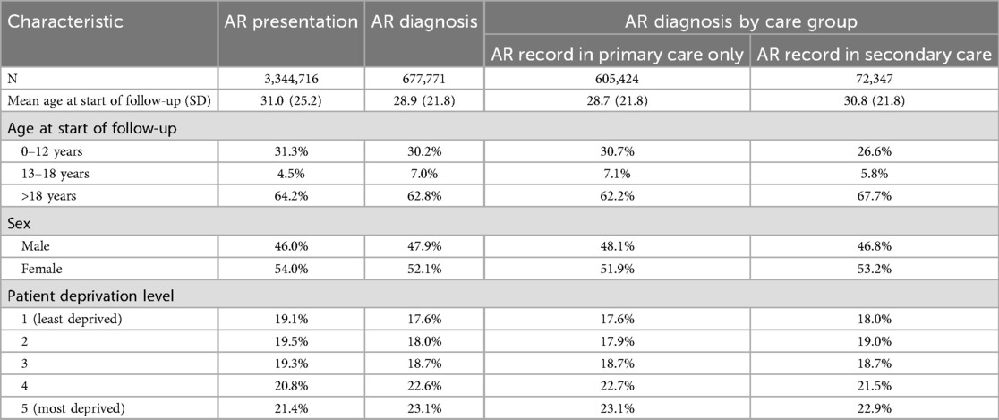 We defined 677,771 patients as having an AR diagnosis between 2009 and 2019, of whom 605,424 (89.3%) had an AR record in primary care only, and 72,347 (10.7%) had an AR record in secondary care (Table 1). Additionally, 3,344,716 patients with AR presentation were defined over the same period, and 138,556 were included in both the AR presentation and AR diagnosis cohorts. Baseline demographic characteristics were broadly similar between all study groups and were largely consistent with the general UK population (24). A slightly higher proportion of patients were from the most deprived quintile than the least deprived, compared to the distribution across the UK (25). Most included patients in each cohort were adults >18 years old, with only 7% of the AR diagnosis cohort and 4.5% of the AR presentation cohort being adolescents aged 13–18 years old at start of follow-up.