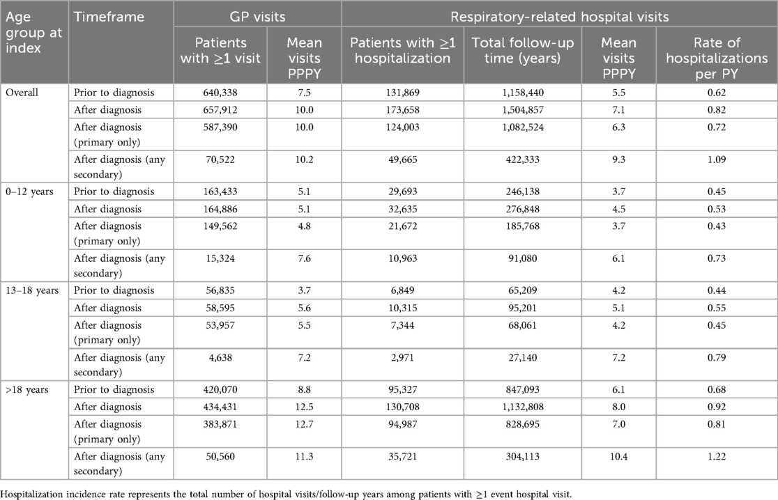 An overall increase in respiratory-related hospital visits was also observed following the diagnosis of AR, with the mean number of visits PPPY increasing from 5.5 pre-diagnosis to 7.1 post-diagnosis for the whole AR diagnosis cohort: this increase was driven primarily by patients with any record in secondary care (9.3 PPPY, 60% increase from full cohort pre-baseline values) with a similar trend observed across each age group (Table 2). The proportion of patients reporting ≥1 hospital visit also increased from 19% pre-diagnosis to 26% post-diagnosis, with a higher proportion of patients in the any secondary care group reporting ≥1 hospital visit post-diagnosis compared to the primary care only group (69% vs. 20% respectively). A similar trend was observed across all age groups (Table 2).