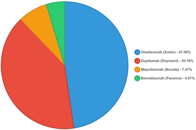 Figure 1 illustrated the distribution of biologic therapies among the patient cohort. The data showed that the predominant use of omalizumab in this population, followed by dupilumab, with lower utilization of mepolizumab and benralizumab. Hence, the most frequently prescribed biologic was omalizumab (Xolair), used in 51 patients (47.66% of the total). Dupilumab (Dupixent) was the second most common, prescribed to 43 patients (40.18%). Mepolizumab (Nucala) and benralizumab (Fasenra) were less frequently used, with 8 (7.47%) and 5 (4.67%) patients, respectively.