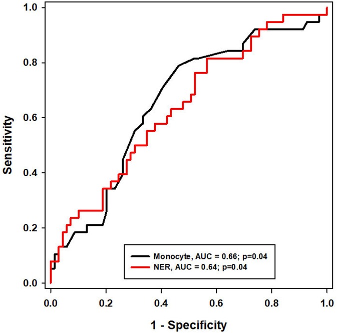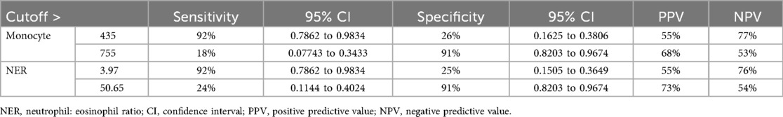 Figure 3 displayed ROC curves for monocyte count and the NER and showed that both biomarkers had modest but statistically significant discriminatory power in predicting asthma exacerbations following biologic therapy (AUC = 0.66 and 0.64, respectively; both P = 0.04). Table 5 further supported their predictive utility by presenting performance metrics across various cutoff values. Lower cutoffs for monocyte count (>435) and NER (>3.97) provided high sensitivity (92%), making them suitable for screening or ruling out exacerbations, with negative predictive values (NPV) around 76%–77%. However, this came at the expense of low specificity and only moderate positive predictive value (PPV ∼55%). In contrast, higher cutoffs for monocyte count (>755) and NER (>50.65) achieved high specificity (91%) and stronger PPVs (68% for monocyte, 73% for NER), making them more effective for confirming exacerbation risk, despite their poor sensitivity. This analysis suggested that the choice of cutoff value depended on whether the clinical objective was to rule out or confirm the likelihood of exacerbation.