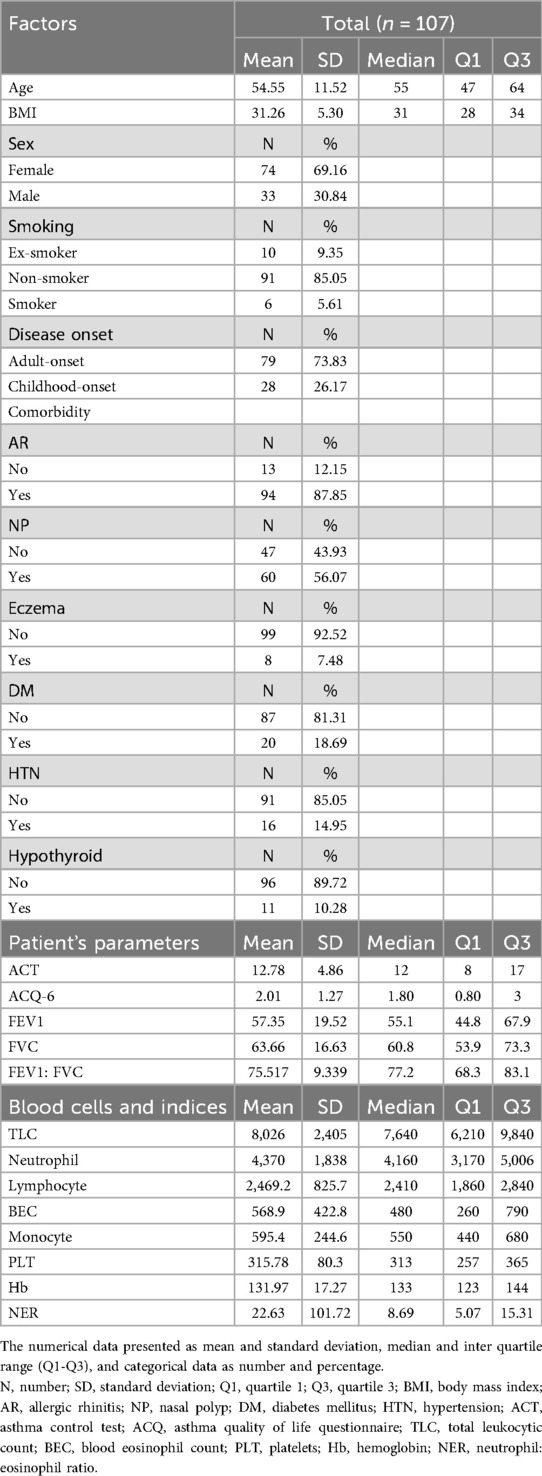 Generally, while eosinophil count remains the cornerstone for guiding biologic use, integrating neutrophil counts and NER could enhance our ability to identify patients with difficult-to-treat phenotypes, particularly those with T2-low inflammation (19, 20). However, comprehensive data on the impact of biologics on neutrophils and NER, especially in non-T2 asthma, remain limited and warrant further investigation. From that point of view, this study designed to evaluate the role of routine hematologic indices, particularly, blood neutrophils and NER as a predictive biomarkers of disease control and exacerbations risks following biologic therapy.