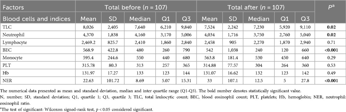 Table 2 illustrated the impact of biologic therapy on different blood cells and indices, a statistically significant reduction was noted in the TLC and neutrophil count (both p = 0.02), suggesting a suppressive effect on overall leukocytic and neutrophilic inflammation. The BEC showed the most pronounced decline (median reduced from 480 to 240, p < 0.001), a finding consistent with the mechanism of action of biologics that target type 2 inflammation. Interestingly, the neutrophil-to-eosinophil ratio (NER) significantly increased after treatment (p < 0.001), which reflects the disproportionately greater reduction in eosinophils compared to neutrophils. Other hematological parameters, including lymphocyte count, monocyte count, PLT, and Hb, showed no statistically significant changes, indicating that the biologic therapy's effect is selective toward eosinophils and neutrophils rather than causing broad hematological alterations. Overall, biologic therapy effectively reduces eosinophilic inflammation, with parallel but smaller decreases in TLC and neutrophils. The marked rise in NER is a key finding, underscoring eosinophil suppression as the dominant hematologic signature of this treatment. Clinically, this selective dampening of type 2 inflammation aligns well with the therapeutic goal of biologics in severe asthma and related diseases, and it's achieved without inducing generalized cytopenia.