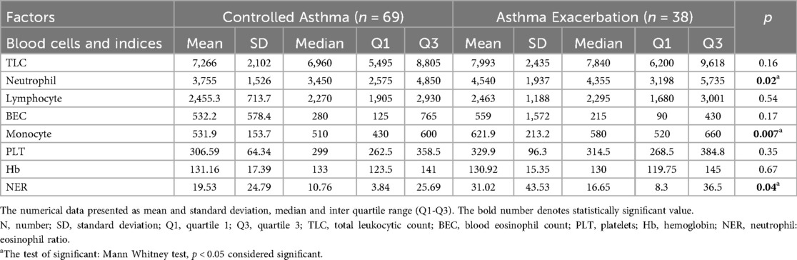 Table 3 revealed that, among patients with severe asthma following biologic therapy, certain blood indices were significantly associated with asthma exacerbations. Patients who experienced exacerbations had significantly higher neutrophil counts (P = 0.02) and markedly elevated monocyte counts (P = 0.007) compared to those with controlled asthma. Importantly, the Neutrophil-to-Eosinophil Ratio (NER) was also significantly higher in the exacerbation group (P = 0.04). In contrast, there were no statistically significant differences between the two groups in total leukocyte count, lymphocyte count, blood eosinophil count (BEC), platelet count, or hemoglobin levels.