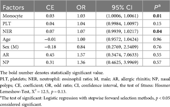 Table 4, derived from logistic regression analysis, identified monocyte count and the NER as statistically significant predictors of asthma exacerbation. Each unit increase in monocyte count was associated with a 3% increase in the odds of exacerbation (OR=1.03, P = 0.01), while each unit increase in NER corresponded to a 7% increase in the odds (OR = 1.07, P = 0.04). Other variables, including platelet count, age, sex, allergic rhinitis, and nasal polyps, did not emerge as significant predictors in the model.