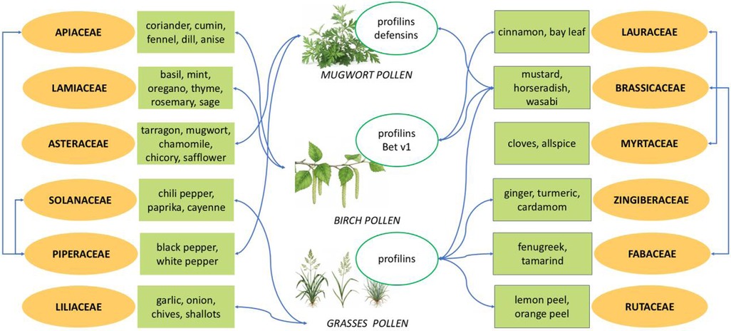 Figure 1 presents a schematic overview of known cross-reactivity patterns between spices, pollens, and related plant sources, emphasizing the role of similar allergens.