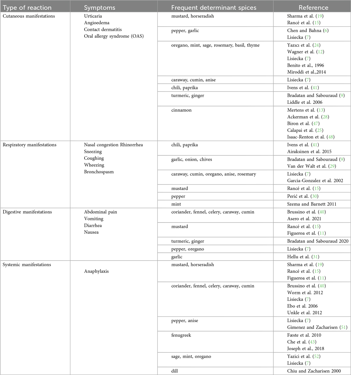The clinical spectrum of allergic reactions to spices and herbs is broad, ranging from mild localized symptoms to severe systemic responses (Table 1). In children, the onset of allergic reactions can be early in life [a study by Rancé et al. (15) reported that the majority of children developed mustard allergy under the age of 3], but symptoms can also appear later on, in adolescence (16, 24).