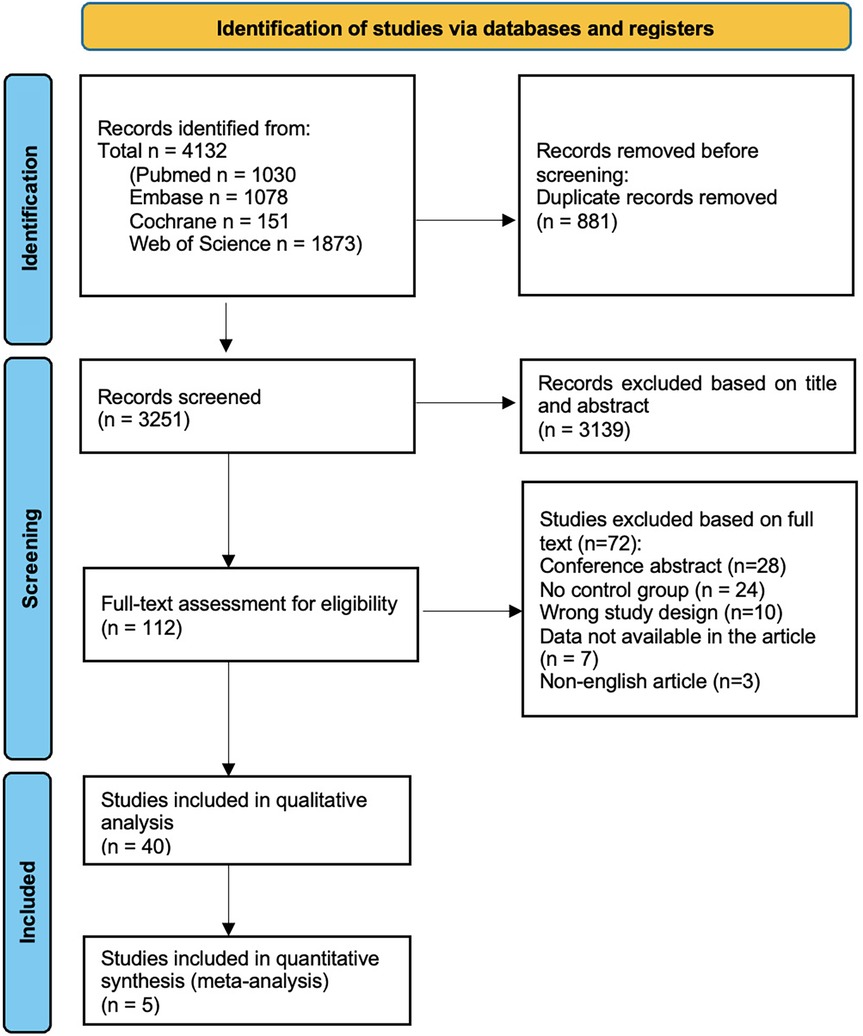 A total of 4,132 citations were retrieved from the initial and update search of electronic databases. After removing 881 duplicates and 3,139 articles based on title and abstract, 112 articles remained for full-text review. Forty studies met all inclusion criteria and underwent data extraction and synthesis. The PRISMA flowchart is presented in Figure 1.