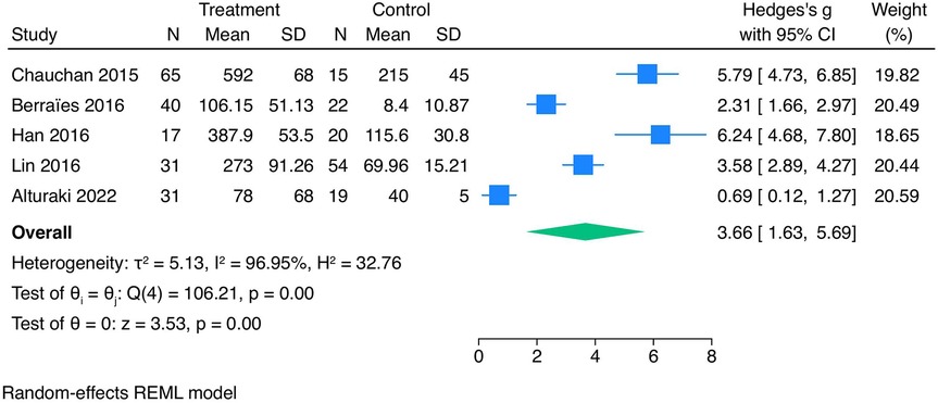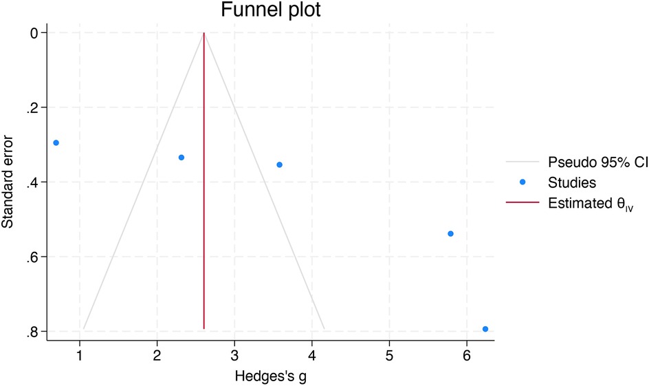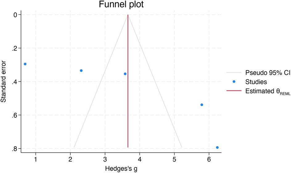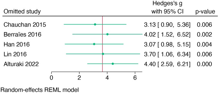 The total heterogeneity was very high (I2 = 98.26%). However, the sensitivity analysis (leave-one-out) showed that no individual study influenced the pooled effect estimate, confirming the robustness of the findings (Figure 3). Meta-regression was not conducted due to the limited number (n = 5) of studies in the meta-analysis.