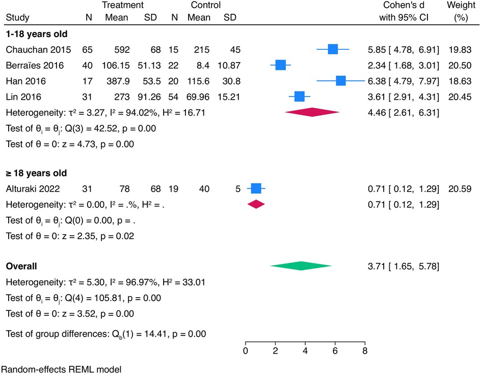 A random effect model was selected due to variability in laboratory techniques used. Outcomes were reported as mean and standard deviation. Effect sizes were pooled as standardized mean difference (SMD). Heterogeneity was used using I2, H2, and τ2 statistics. Heterogeneity was categorized as low (<25%), moderate (25%–50%), and high (>50%). A leave-one-out sensitivity analysis was conducted to assess the influence of individual studies on the overall effect estimate. Publication bias was assessed using Egger's test and funnel plots. To examine potential sources of heterogeneity in the meta-analysis, subgroup analysis based on the age of groups was conducted.
