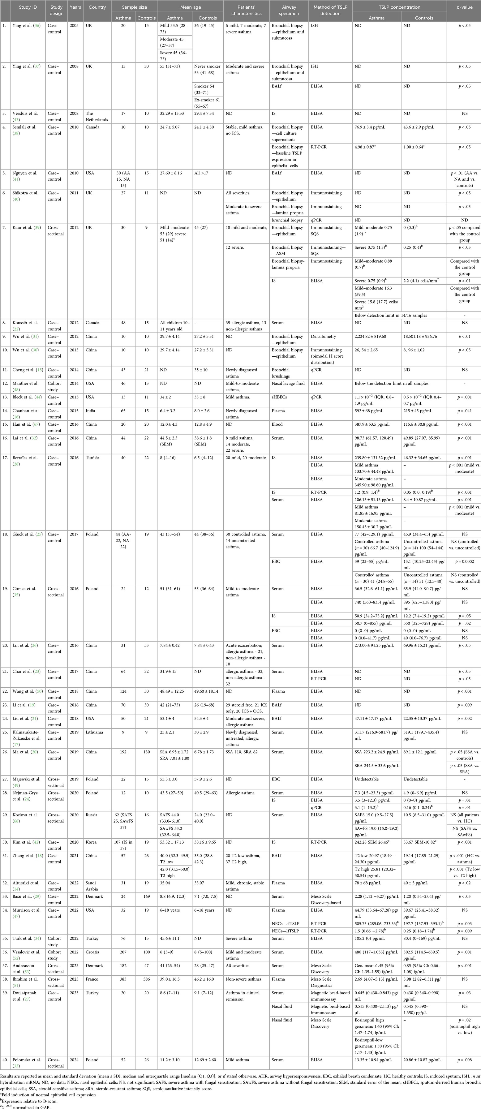Twelve studies enrolled patients with varying asthma severity, divided into mild, moderate, and severe cases, while two included individuals with all asthma severities. The study by Alturaiki et al. (14) included patients with chronic stable, mild asthma. Four studies included untreated patients with newly diagnosed asthma (15–18). The study by Li et al. (19) included patients with variable control of asthma and stratified them according to treatment intensity: untreated, treated with inhaled corticosteroids (ICS), and treated with both ICS and oral corticosteroids (OCS). The study by Ma et al. (20) included patients with steroid-sensitive asthma and steroid-resistant asthma based on the improvement in FEV1 respiratory parameter following 7 days of treatment. The study by Liu et al. (21) enrolled 50 asthmatics with moderate and severe asthma; 10 among them were treated with OCS, and 13 received monoclonal antibodies—omalizumab. Studies by Koussih et al. (22) and Chai et al. (23) enrolled allergic and non-allergic asthmatics, while the study by Nejman-Gryz et al. (24) included only allergic asthmatic patients. The study by Glück et al. (25) compared TSLP concentration in controlled and uncontrolled asthmatics to healthy controls. The study by Lin et al. (26) included only patients with acute asthma exacerbation. The study by Doulatpanah et al. (27) enrolled asthmatic children in clinical remission. A study Zhang et al. (18) enrolled 57 newly diagnosed, treatment-naive patients and divided the asthmatic study group into T2-high and T2-low endotypes based on the expression of certain genes in epithelial brushings. In 11 studies, the severity and clinical profile of the asthmatic population were not specified.