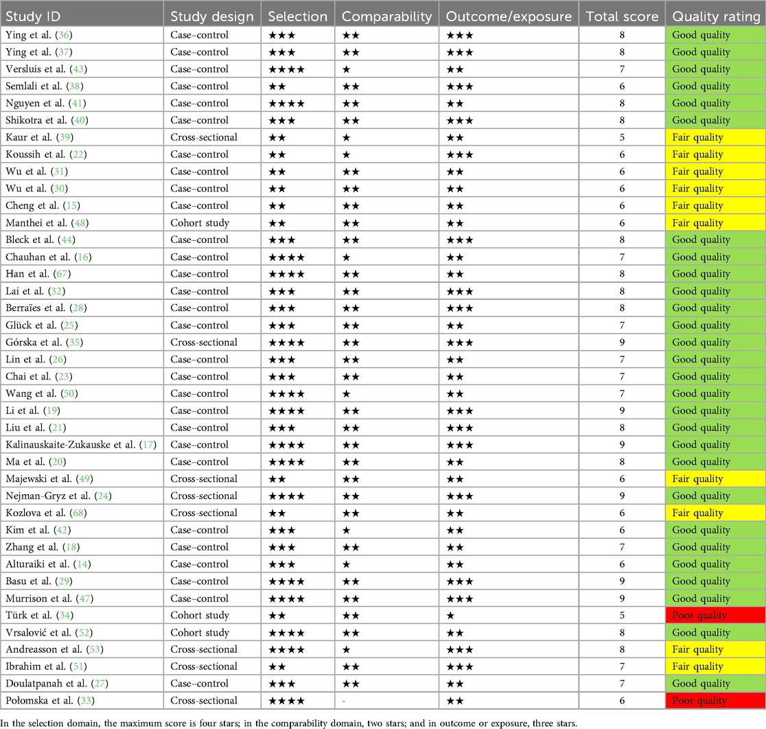 The risk of bias was assessed with the Newcastle Ottawa scale (NOS) adapted for case–control studies, cross-sectional studies, and cohort studies (13). Risk of bias in included studies was assessed independently by two reviewers (IO and PK). In case of disagreement, the third investigator (MD) made the final decision.
