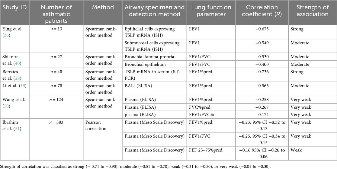 Nine studies examined the correlation between TSLP concentration and lung function. Six studies reported significant inverse correlation: five studies between TSLP expression and spirometry parameters (FEV1%, FEV1/FVC, FVC%) (19, 28, 36, 40, 50, 51). Three studies found no correlation between TSLP and lung function parameters (22, 25, 52). The correlation coefficients, strengths of correlations, and type of analyzed biological specimens are summarized in Table 3.