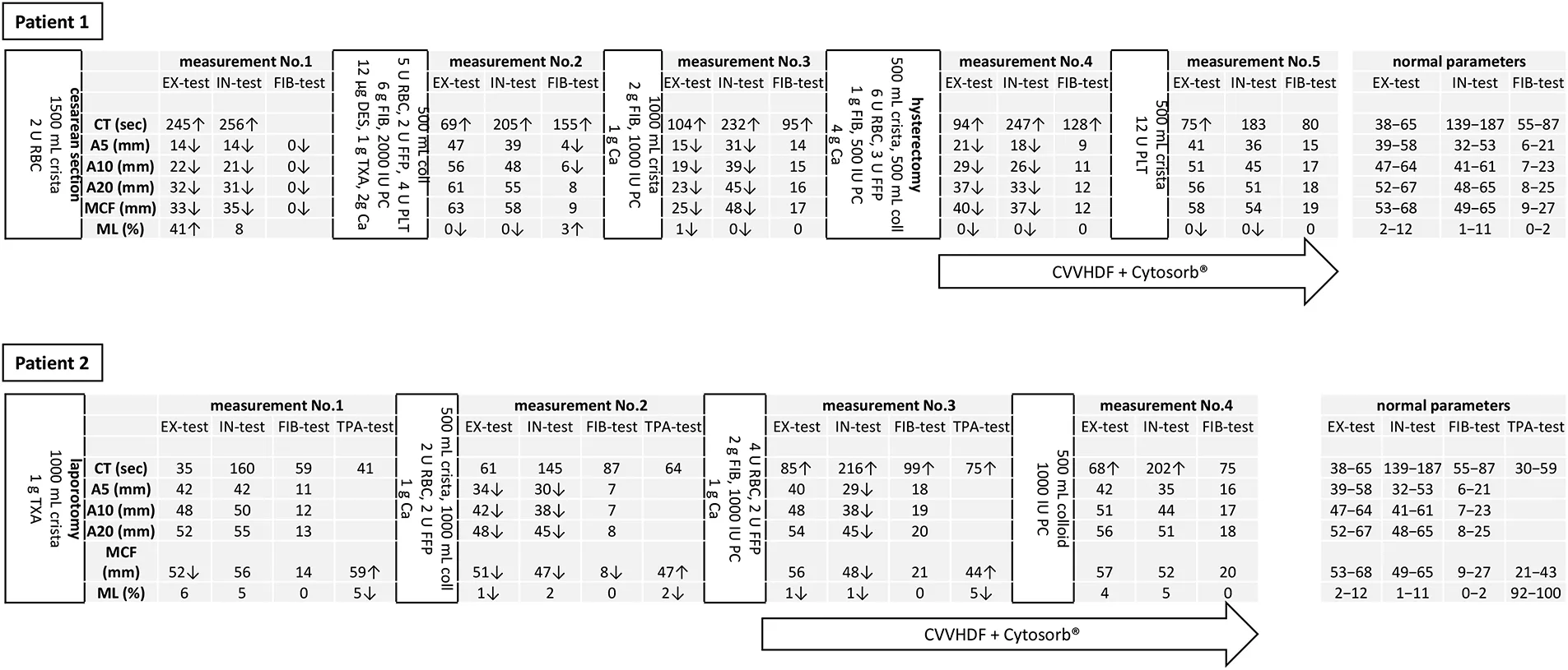 EX, extrinsic; IN, intrinsic; FIB, fibrinogen; TPA, tissue plasminogen activator; crista, cristalloid; coll, colloid; RBC, red blood cell; FFP, fresh frozen plasma; PLT, platelet; PC, prothrombin complex; DES, desmopressin; TXA, tranexamic acid; Ca, calcium gluconate; CVVHDF, continuous veno-venous hemodiafiltration.