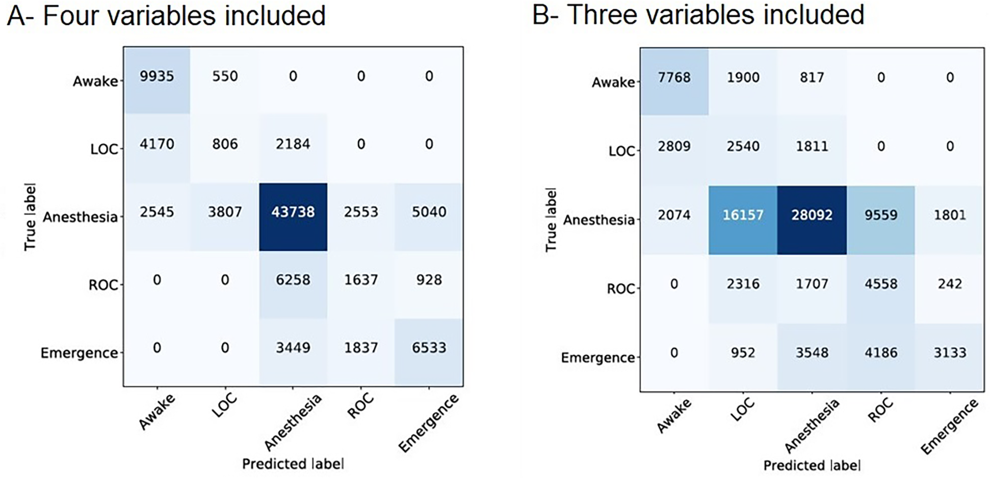 We describe the complete performances of the classification obtained by our model with a normalized confusion matrix and several metrics. Results including four variables are presented in the Figure 4A. The rows present the true states identified by the EEG and the columns present the states predicted by the algorithm. In the Table 2, we present four different metrics assessing the performance of our method when four variables were included. For the prediction of the Anesthesia state, the true positive rate (TPR) is 72% with a high positive predictive value (PPV) of 84%. However, the negative predictive value is rather low with 59%: when the model predicts that the patient is not in the Anesthesia state, it is wrong in 41% of the cases.