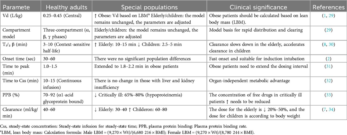 (3) Obese patients: Obese patients: The volume of distribution (Vd) of remifentanil was positively correlated with lean body mass (LBM) (*r* = 0.89), and clearance (CL) was independent of total body weight. It is recommended to calculate the dose according to LBM (see Table 1 for the formula) to avoid respiratory depression due to overdose (1). As shown in Figure 1, the pharmacokinetic curve of remifentanil shows its rapid peaking and clearance properties (2).