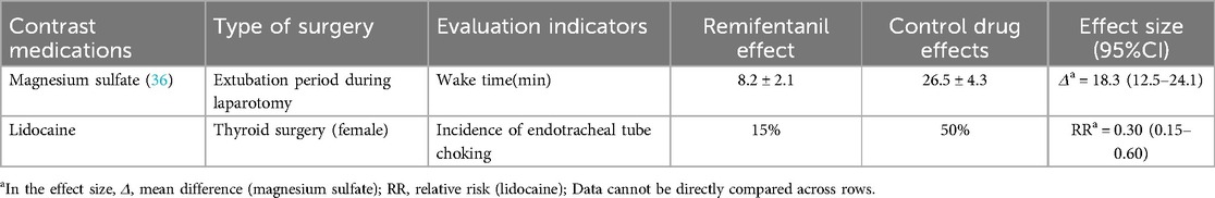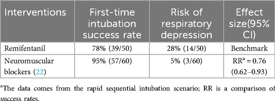 In rapid sequence intubation, the first-pass intubation success rate of Remifentanil was significantly lower than that of neuromuscular blockers (risk ratio = 0.76, 95% CI 0.62–0.93), but the wide confidence interval suggests that its potential non-inferiority needs to be validated in large sample studies. Notably, the risk of respiratory depression with Remifentanil may limit its application in scenarios requiring rapid airway management. Subsequent additions are shown in Table 5.