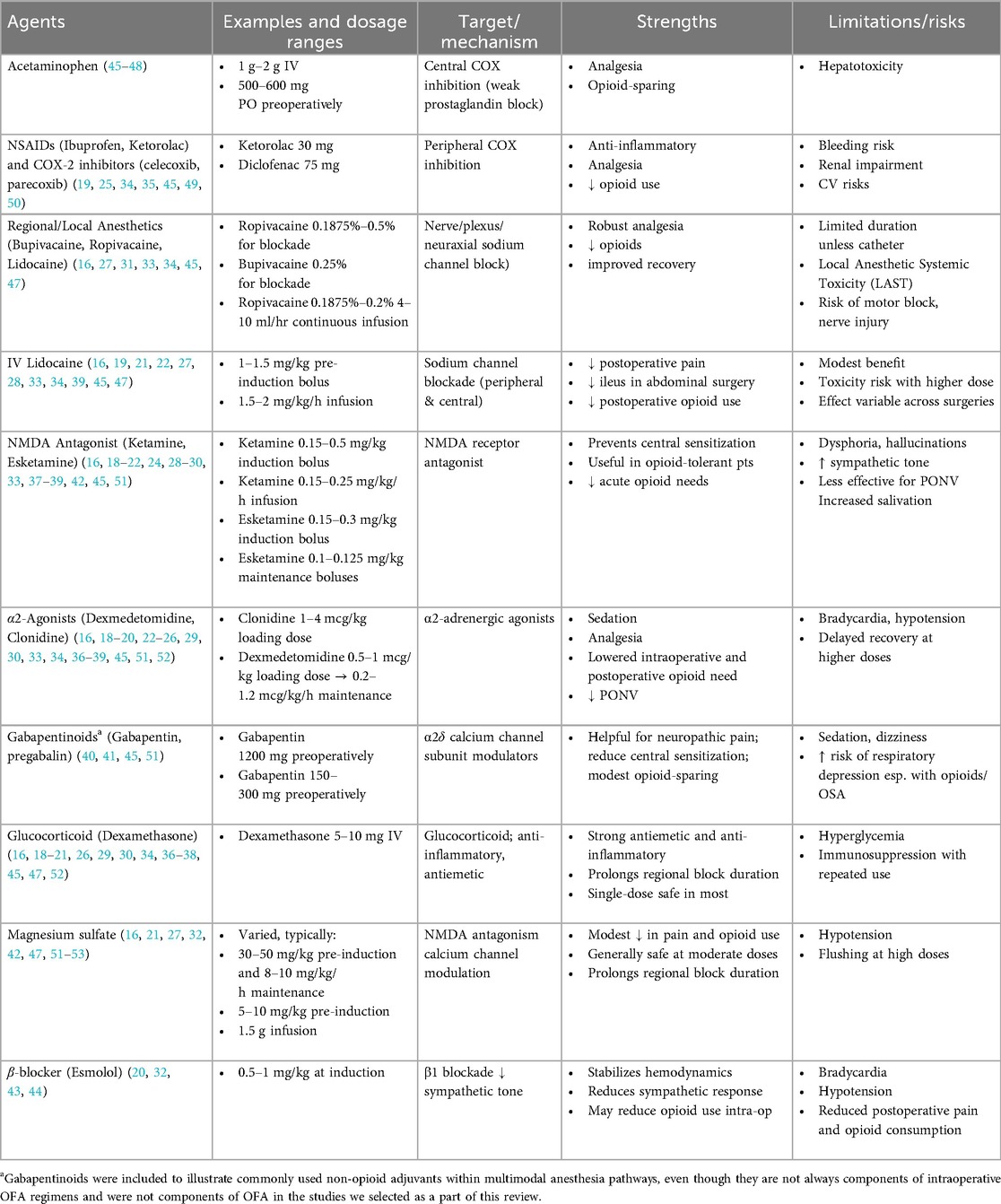 Through synergistic interactions, these agents can prevent central sensitization, maintain hemodynamic stability, and provide effective pain control. This combined approach may reduce ORADEs and the risk of long-term opioid misuse. For example, perioperative use of lidocaine, ketamine, and gabapentinoids has been shown to reduce the risk of CPSP for up to 6 months (40), and perioperative gabapentin decreased the time to opioid cessation post-surgery (41). Additionally, individually ketamine and magnesium can maintain stability of blood pressure and heart rate, respectively (42). Esmolol was found to reduce pain and postoperative opioid consumption (43) and has shown to pose an opioid-sparing effect intraoperatively (44). The effectiveness and safety of OFA can differ based on the type of surgery (Table 1).