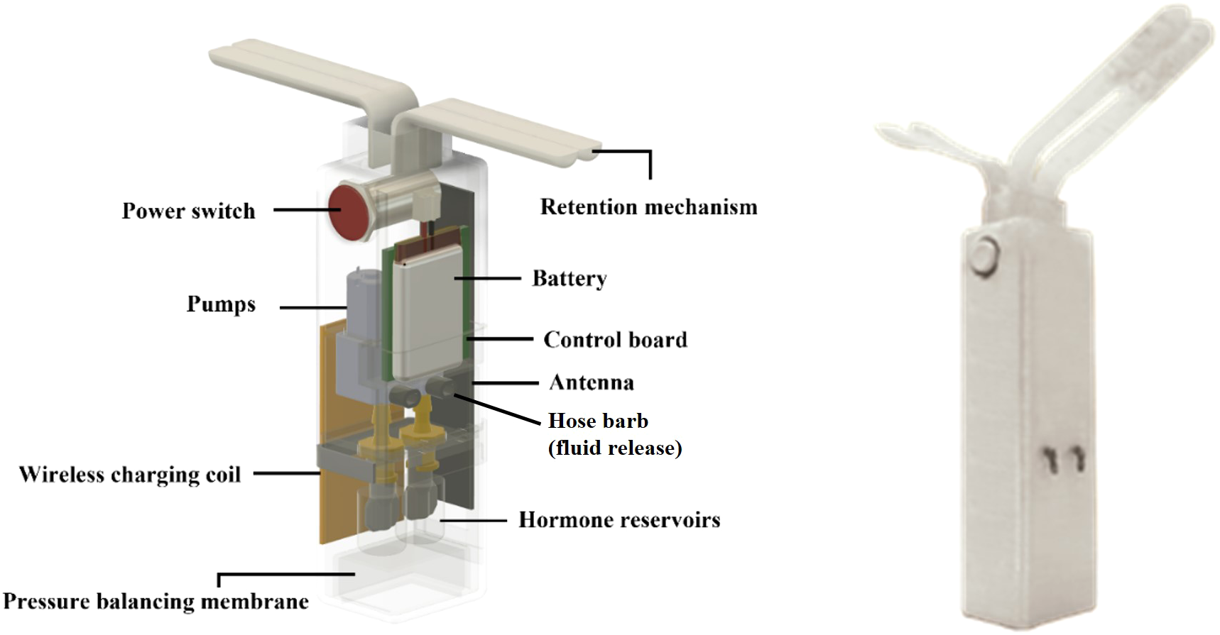 3D model (left) of the e-Synch device and its components and fully assembled e-Synch device (right). e-Synch consists of an outer case 3D-printed, with two double Nylon wings for retention, and a flexible silicone membrane at the bottom for pressure balancing during drug delivery. A power switch and flexible wideband antenna are placed on the side. Internal components include a central control board and two silicone hormone reservoirs with ~5 mL capacity connected to individual peristaltic pumps through a Luer lock connection. Polyethylene elbows with hose barb are connected to each peristaltic pump and placed onto one of the laterals of the device. A Lipo battery is sealed inside the case to provide power. A Qi wireless charging coil with a receiver module is attached to the external side of the device to serve as a power input for the micro-Lipo charger through a sealed hole.