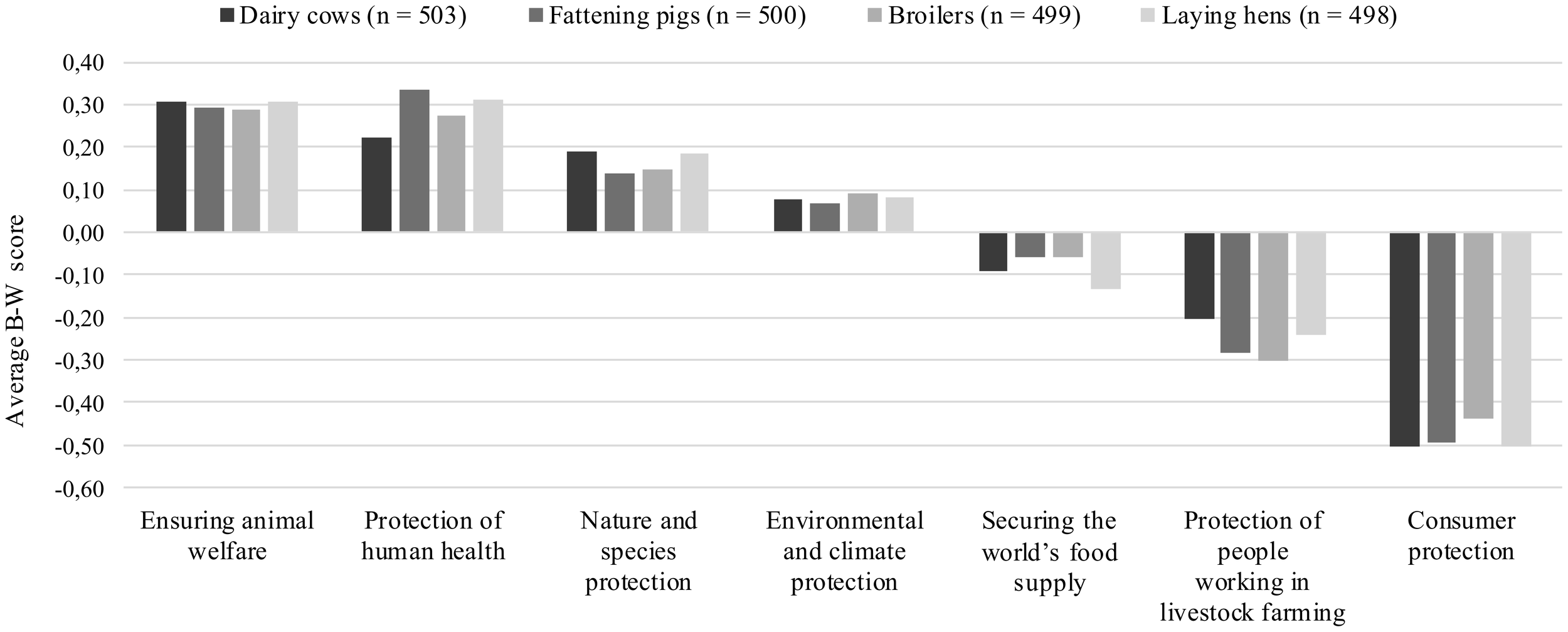 With regard to the B–W score and average B–W score, results show that for dairy cows and broilers, participants evaluated the aspect “ensuring animal welfare” as most important and the aspect “protection of human health” as the second-most important (Table 6; Figure 1). For fattening pigs and laying hens, “protection of human health” was assigned the highest importance, whereas “ensuring animal welfare” was assigned second-highest importance. For the remaining five aspects, the ranking order was the same for all four types of farm animals: in third place was “nature and species protection”, followed by “environmental and climate protection”, then “securing the world’s food supply”, then “protection of people working in dairy/pig fattening/broiler/laying hen farming”, and then “consumer protection” was ranked last.