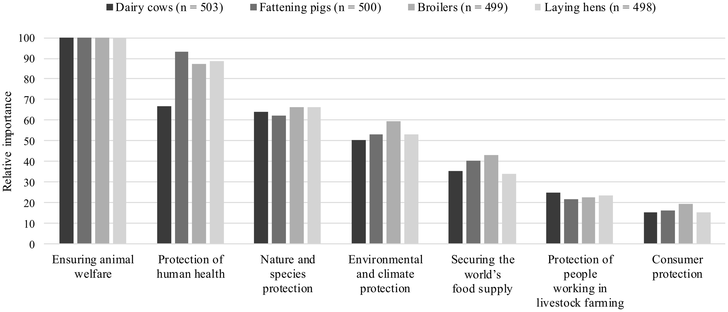 Looking at the relative importance, the ranking order was the same for all four subsamples, with “ensuring animal welfare” being the most important aspect and assigned a relative importance of 100, serving as a benchmark (Table 6; Figure 2). The second-most important aspect was “protection of human health” with a value of 66.8 for dairy cows, 93.1 for fattening pigs, 87.1 for broilers, and 88.5 for laying hens. The aspect “environmental and climate protection” was in the middle of the rankings, with 50.3 for dairy cows, 52.9 for fattening pigs, 59.7 for broilers, and 53.2 for laying hens, which means that this aspect was considered to be approximately half as important as “ensuring animal welfare”. In other words, the probability of “environmental and climate protection” being selected was half that of “ensuring animal welfare” being selected. The aspect rated as least important was “consumer protection”, with a probability of being selected of 15.4 for dairy cows, 16.2 for fattening pigs, 19.5 for broilers, and 15.3 for laying hens.
