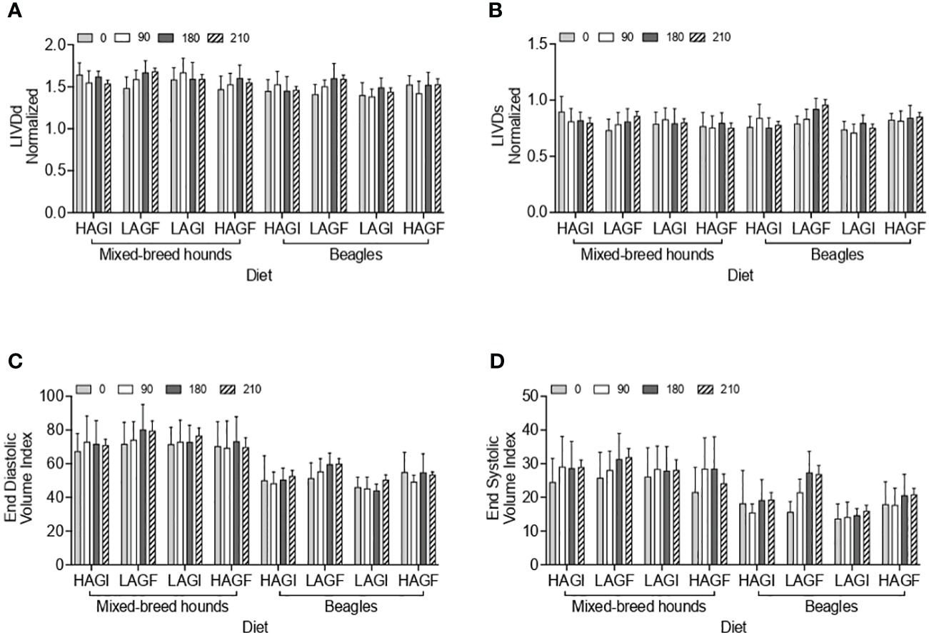 Results: There was a treatment-by-day-by-breed effect observed for the normalized left ventricular internal diameter at end-diastole (p = 0.0387) and for the normalized left ventricular internal diameter at end-systole (p = 0.0178). On day 210, mixed-breed hounds fed the LAGI diet had a smaller normalized left ventricular internal diameter at end-diastole than on day 90. On day 210, beagles fed the LAGF diet had a larger normalized left ventricular internal diameter at end-systole than those fed the LAGI diet. Fractional shortening for beagles in the LAGF group was significantly lower (p = 0.007) than for those in the HAGI and LAGI groups. Cardiac-specific biomarkers and endomyocardial biopsies were not significantly different between breeds, diets, and various time points.