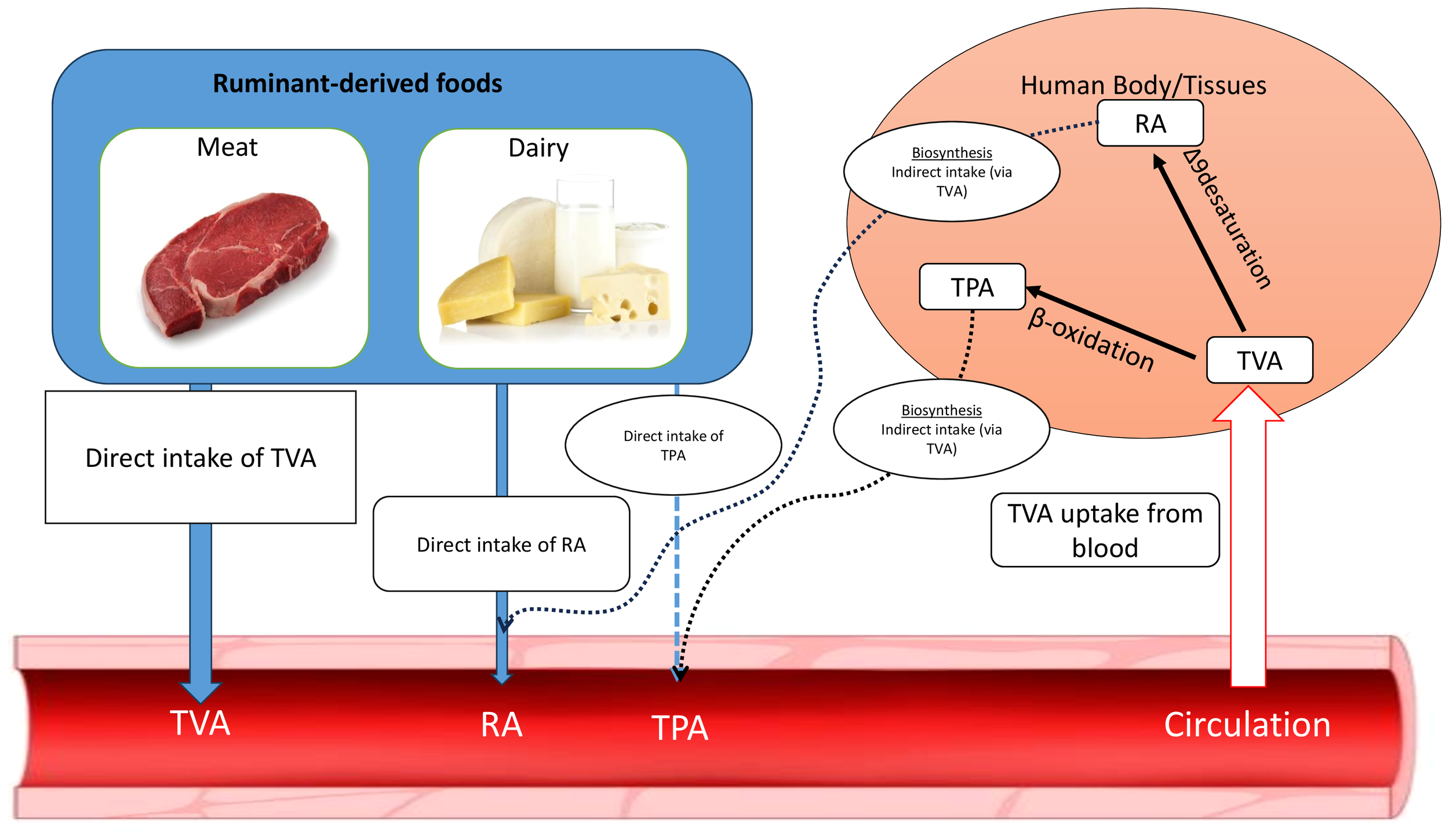 In addition to Δ-9 desaturation, chain shortening of TVA by β-oxidation (peroxisomal β-oxidation of TVA) can lead to elevated levels of TPA in the plasma or tissues after consuming foods containing TVA, particularly grass-fed beef and dairy products. The conversion rate of TVA to TPA has been estimated to be 10% in cultured rat hepatocytes incubated with TVA (Jaudszus et al., 2014), however, the whole body (in vivo) conversion rate of TVA to TPA is not known. Given the very low concentration of TPA in the food supply including ruminant-derived foods (<0.05% of total fatty acids), the major origin of circulating TPA in humans is assumed to be from TVA intake from consumption of ruminant derived foods (Jaudszus et al., 2014).