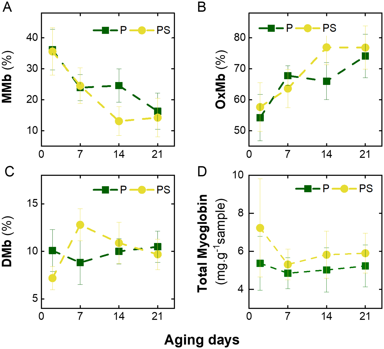 Variation in heme pigments with days of aging of LTL muscle from Braford steers stored in vacuum package at 2°C fed ad libitum grass (P) or grass supplemented with corn silage (PS). (A) Proportion of Metmyoglobin (%MMb), (B) oxymyoglobin (%OxMb), (C) deoxymyoglobin (%DMb), and (D) total myoglobin (Mb).