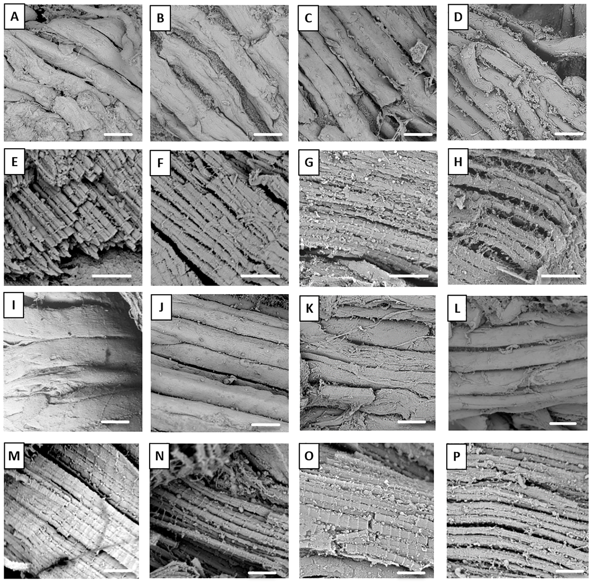 Scanning electron microscopy (SEM) images were obtained at a magnification of 1000x (i.e., white bars of 50 µm) for 2, 7, 14, and 21 days of aging, respectively (panels A through D and I through L), while for the sarcomere structure, a magnification of 15000x (i.e., white bars of 5 µm) was selected for the same aging days (panels E through H and M through P). The LTL muscle samples from Braford steers stored in a vacuum package at 2°C and fed grass (P) are presented in figures A–H, while those fed grass supplemented with corn silage (PS) are presented in panels I–P.