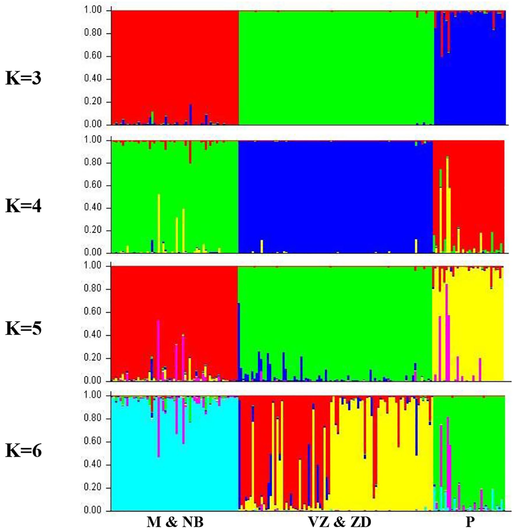 Population structure was analyzed using STRUCTURE software (v2.3.4) under an admixture model with correlated allele frequencies among breeds. Burn-in and Monte Carlo Markov Chain (MCMC) simulations were set to 200,000 and 100,000 iterations, respectively, with 10 independent runs for each number of clusters (K ranging from 2 to 6). Results were processed using STRUCTURE HARVESTER (Evanno et al., 2005) to estimate the likelihood membership coefficient (ΔK) and determine the most probable number of clusters. Dendogram was constructed using Genepop (V.4.7.5) to analyze the genetic diversity among the populations.