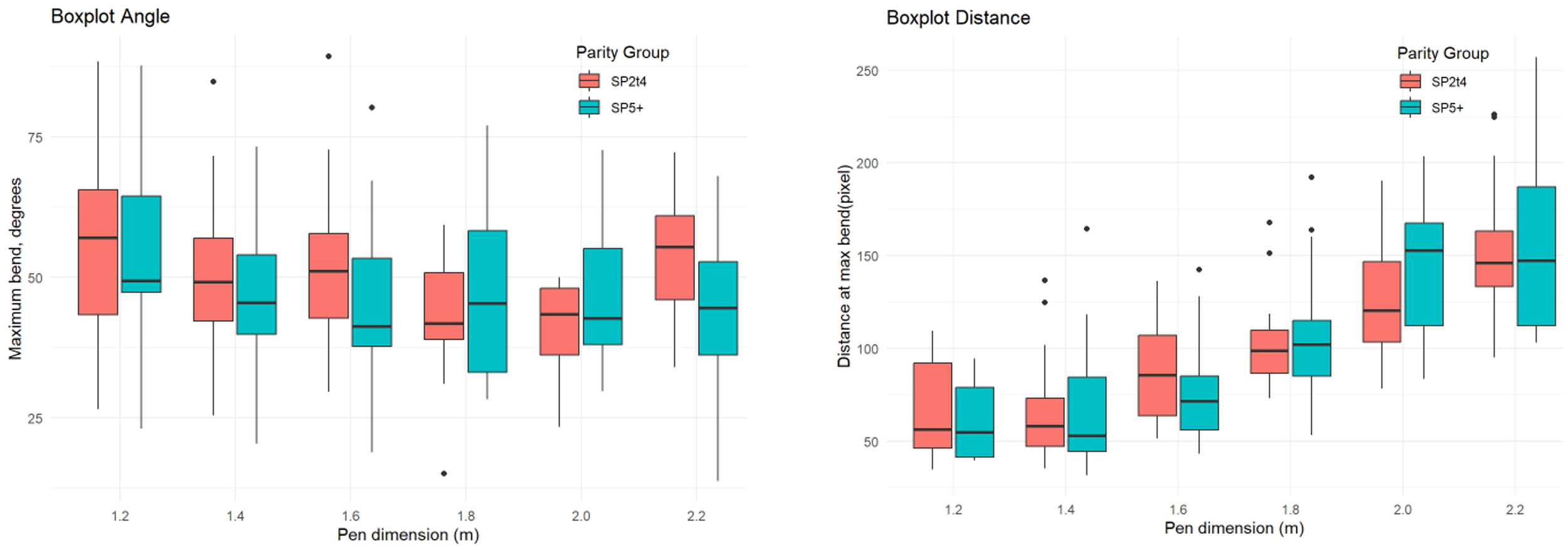 Left: Maximum curvature of body during a turn (degrees) in pen dimensions W1.2 to W2.2 for SP2t4 and SP5+. The box of the boxplot spans from the first quartile to the third quartile (with the line intersecting the box marking the median). The whiskers show the 5th and 95th percentiles, and values beyond these upper and lower bounds are outliers. Right: Distance (in pixels) to the further pen wall at the point of maximum curvature of the body during a turn (degrees) in pen dimensions from W1.2-W2.2 for SP2t4 and SP5+. The box of the boxplot spans from the first quartile to the third quartile (with the line intersecting the box marking the median. The whiskers the 5th and 95th percentiles, and values beyond these upper and lower bounds are outliers. 2 where SP2t4 refers to parity two to four and SP5+ refers to parity five or older sows. 3 where W1.2; W1.4; W1,6; W1,8; W2.0 and W2.2 refers to pen widths of 1.2m to 2.2m.