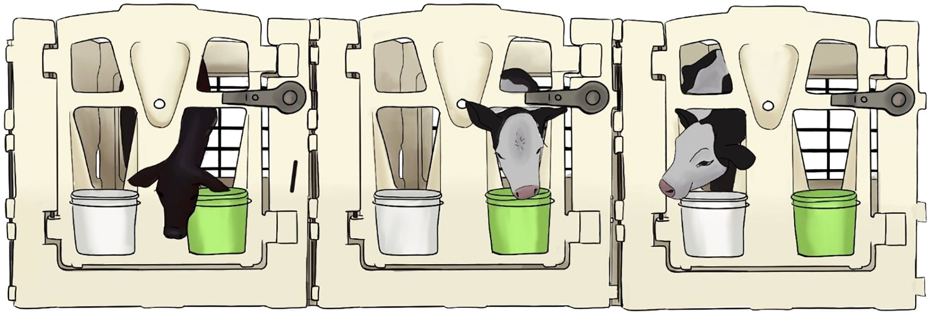 Pre-weaned calves (n = 27; Table 1: 17 Holstein, 10 dairy-beef terminal crosses; 20 female, 7 male) were enrolled in this study at 21 ± 3 d of age to meet the required sample size per treatment (n = 12) for Experiments 1 and 2 (Table 1). The sample size was based on the number of calves per treatment in a similar study that assessed calves’ willingness to consume calf starter when a bitter flavor was added and achieved statistical significance between treatment groups (Terré et al., 2022). All calves were individually housed indoors using calf pens with wire mesh between the pens (1.9 m2, 5’ indoor calf pen, Calf-Tel, Germantown, WI; Figure 1) and bedded with sawdust (September-October) or straw (November-January). Calves were able to contact adjacent calves through the front of their pens and wire panel siding (Figure 1). Water and calf starter (Purina AMPLI-CALF Starter®: crude protein 20%, crude fat 2%, crude fiber 7.5%) were available ad libitum from the time calves were 2 d of age. Milk replacer (Land O’ Lakes Cow’s Match ColdFront PB® BOV DBZ Medicated milk replacer, Arden Hills, MN: crude protein 27%, crude fat 20%, crude fiber 0.3%; 300 g x 1 L water; 3.8 L fed at 38-40°C) was fed twice per day by pail buckets: at 0300h (‘morning feeding’) and 1500h (‘afternoon feeding’). Housing and feeding methods were set by farm procedures and adhered to for this study. To be included in the study, calves had to be healthy (i.e., no fever, signs of respiratory disease, or diarrhea) and not treated for illness within 5 d prior to the study. Calf health was monitored daily by the farm staff. Calves were removed from the study if they were identified as “sick” by the farm staff and treated with electrolytes or antibiotics during the study period.