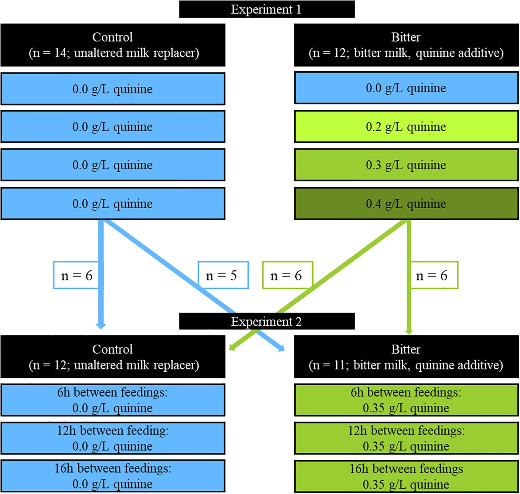 This study was comprised of two experiments. Experiment 1 tested the concentration of a bitter substance added to milk replacer (0.0, 0.2, 0.3, and 0.4 g/L quinine) on calf milk and starter consumption and feeding related behaviors. Experiment 2 tested calf consumption of milk and calf starter and feeding related behaviors after different lengths of time between feedings (6, 12, and 16 h). Calves were consecutively enrolled in Experiment 1 then 2 (Figure 2).