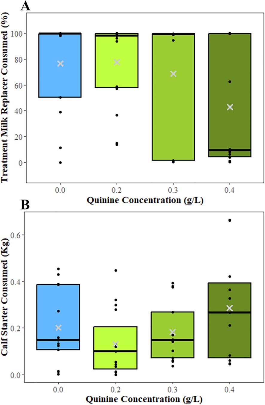 Figure 3. Boxplots showing the median (black line), interquartile range, and mean (gray ×) for (A) percent milk replacer consumed for calves that received bitter milk and (B) amount of calf starter consumed in experiment 1 when calves were provided milk with the quinine concentrations of 0.0 g/L, 0.2 g/L, 0.3 g/L, and 0.4 g/L for their evening meal. Raw values are presented in the boxplots. All calves received every concentration once in a random order. Black dots represent the values of individual calves. Differences found by quinine concentration from the mixed models are denoted with letters; boxes with differing letters were significantly different (P<0.05).