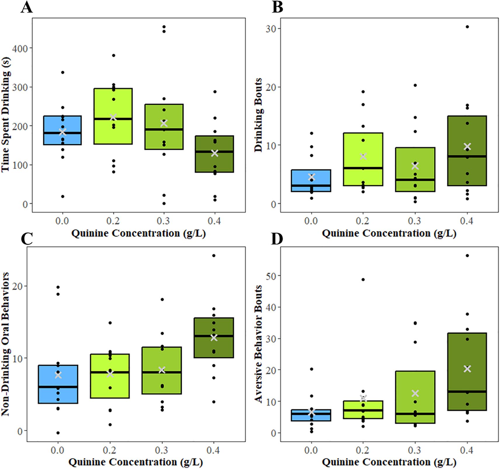 Figure 4. Boxplots showing the median (black bar), interquartile range, and mean (gray ×) for (A) time spent drinking (s), (B) number of drinking bouts, (C) number of non-drinking oral behaviors, and (D) number of aversive behavior bouts in experiment 1 when calves were provided milk with the quinine concentrations of 0.0 g/L, 0.2 g/L, 0.3 g/L, and 0.4 g/L for their evening meal. Raw values are presented in the boxplots. Behavioral analysis was performed from the time milk was delivered to 30 min after milk delivery. All calves received every quinine concentration once in a random order. Black dots represent the values of individual calves. Differences found by quinine concentration from the mixed models are denoted with letters; boxes with differing letters were significantly different (P<0.05).
