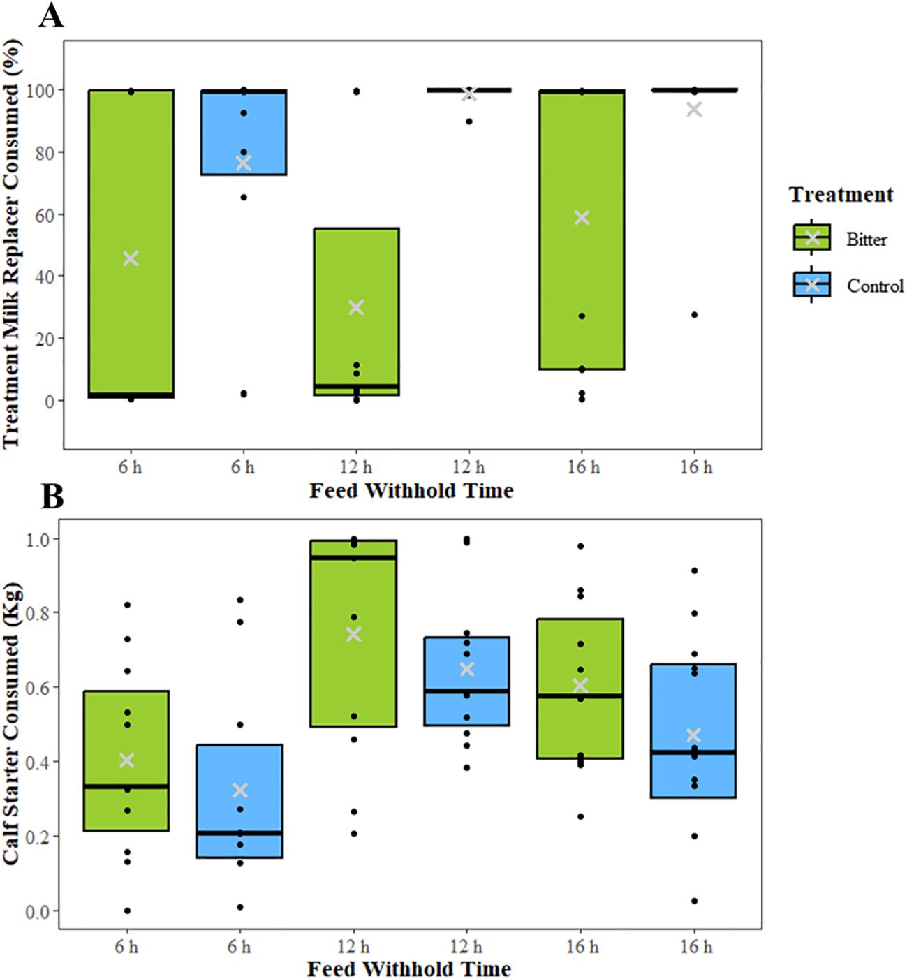 Figure 5. Boxplots showing the median (black line), interquartile range, and mean (gray ×) for (A) percent milk replacer consumed and (B) amount of calf starter consumed in experiment 2 when calves were provided either milk with 0.35 g/L quinine (bitter) or unaltered milk (control) after feed was withheld for 6 h, 12 h, or 16 h. Raw values are presented in the boxplots. Behavioral analysis was performed from the time the milk was delivered to 30 min after milk delivery. All calves received experienced each milk withhold time once in a random order. Black dots represent the values of individual calves. Differences found by quinine treatment from the mixed models are denoted with letters, and differences found by feed withhold time from the mixed models are denoted with symbols. Comparisons were made between treatments within each time point, and within treatments across withhold times. Boxes with different letters or symbols were significantly different (P < 0.05).