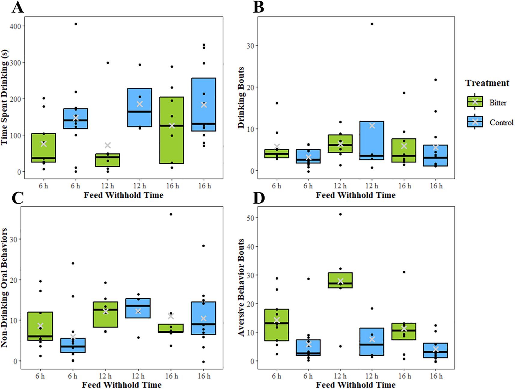 Figure 6. Boxplots showing the median (black line), interquartile range, and mean (gray ×) for (A) time spent drinking (s), (B) number of drinking bouts, (C) number of non-drinking oral behaviors, and (D) number of aversive behavior bouts in experiment 2 when calves were provided either milk with 0.35 g/L quinine (bitter) or unaltered milk (control) after feed was withheld for 6 h, 12 h, or 16 h. Raw values are presented in the boxplots. All calves received experienced each milk withhold time once in a random order. Black dots represent the values of individual calves. Differences found by quinine treatment from the mixed models are denoted with letters, and differences found by feed withhold time from the mixed models are denoted with symbols. Comparisons were made between treatments within each time point, and within treatments across withhold times. Boxes with different letters or symbols were significantly different (P < 0.05).
