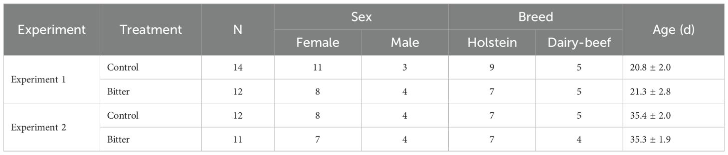 Table 1. Final calf characteristics including sex, breed, and age at enrollment in the control and bitter treatments for both Experiment 1 and Experiment 2 of the study.