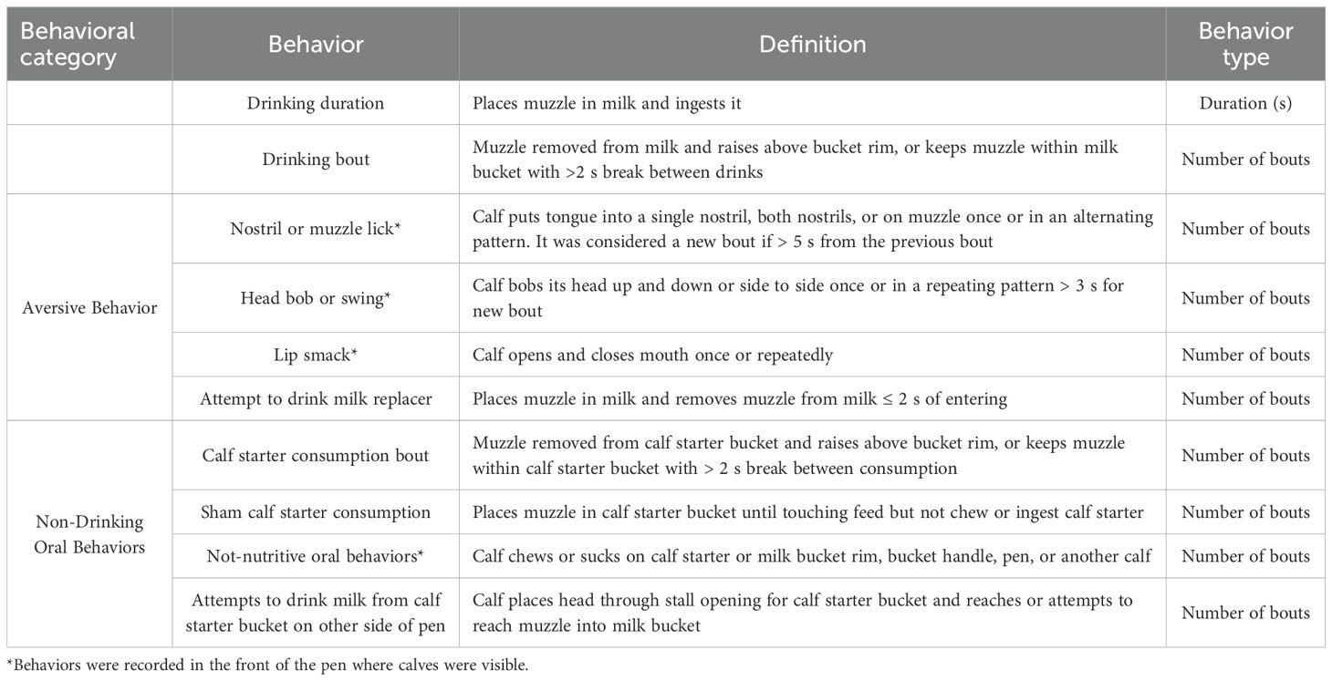 Calves were offered 3.8 L of milk replacer in a bucket during experimentation and buckets were removed 30 min after delivery, which was considered the milk feeding test period. During the milk feeding test period, calves had access to calf starter but not water. Calf behavior was continuously recorded with video cameras (EK700, Akaso, Frederick, Maryland) during the milk feeding test period. Cameras were placed approximately 0.9 m from the pen and 1.5 m from the ground, angled downward so it was possible to see the bottom of the milk bucket. Behavior data were observed from video using continuous observation in Boris software (Version 8.13, Torino, Italy) using an ethogram developed to capture feeding behaviors (Table 2). Two observers were trained to analyze videos from 10 videos that were 30 min long. A different set of 10 videos, 30 min in length were used to calculate interobserver reliability using the intraclass correlation coefficient including all duration and frequency data (R2 = 0.98). Both observers were blind to the treatment calves received during video analysis.