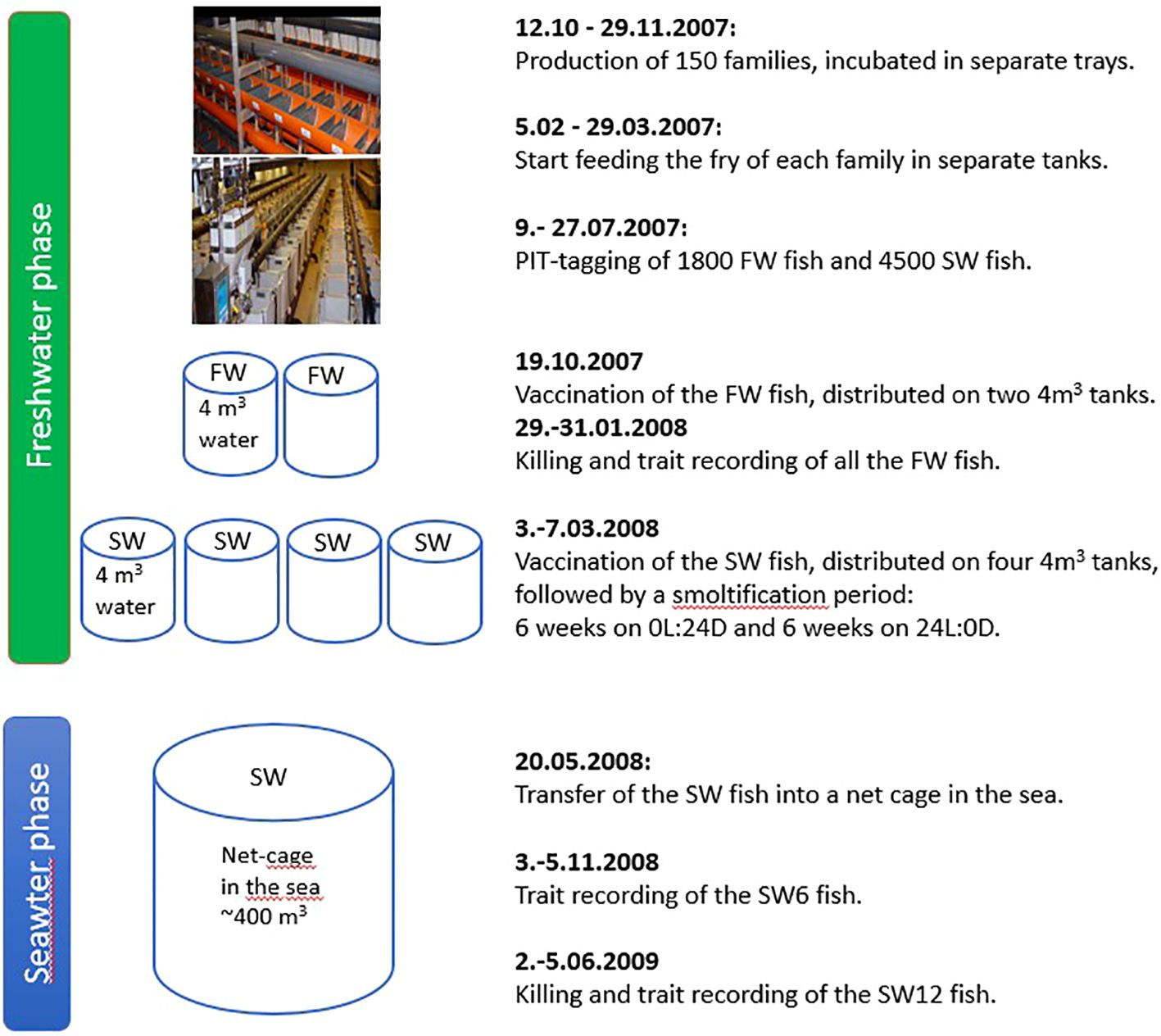 The FW fish in the two replicated tanks were all killed and recorded for the studied traits on the 29th to the 31st of January 2008. A random sample of the SW fish within each family (a maximum of 12 fish per family) was recorded on the 3rd to the 5th of November 2008 (8 months after vaccination, 6 months after sea transfer), while the remaining SW fish were recorded on the 2nd to the 5th of June 2009 (15 months after vaccination, 12 months after their transfer to the net cage in the sea).