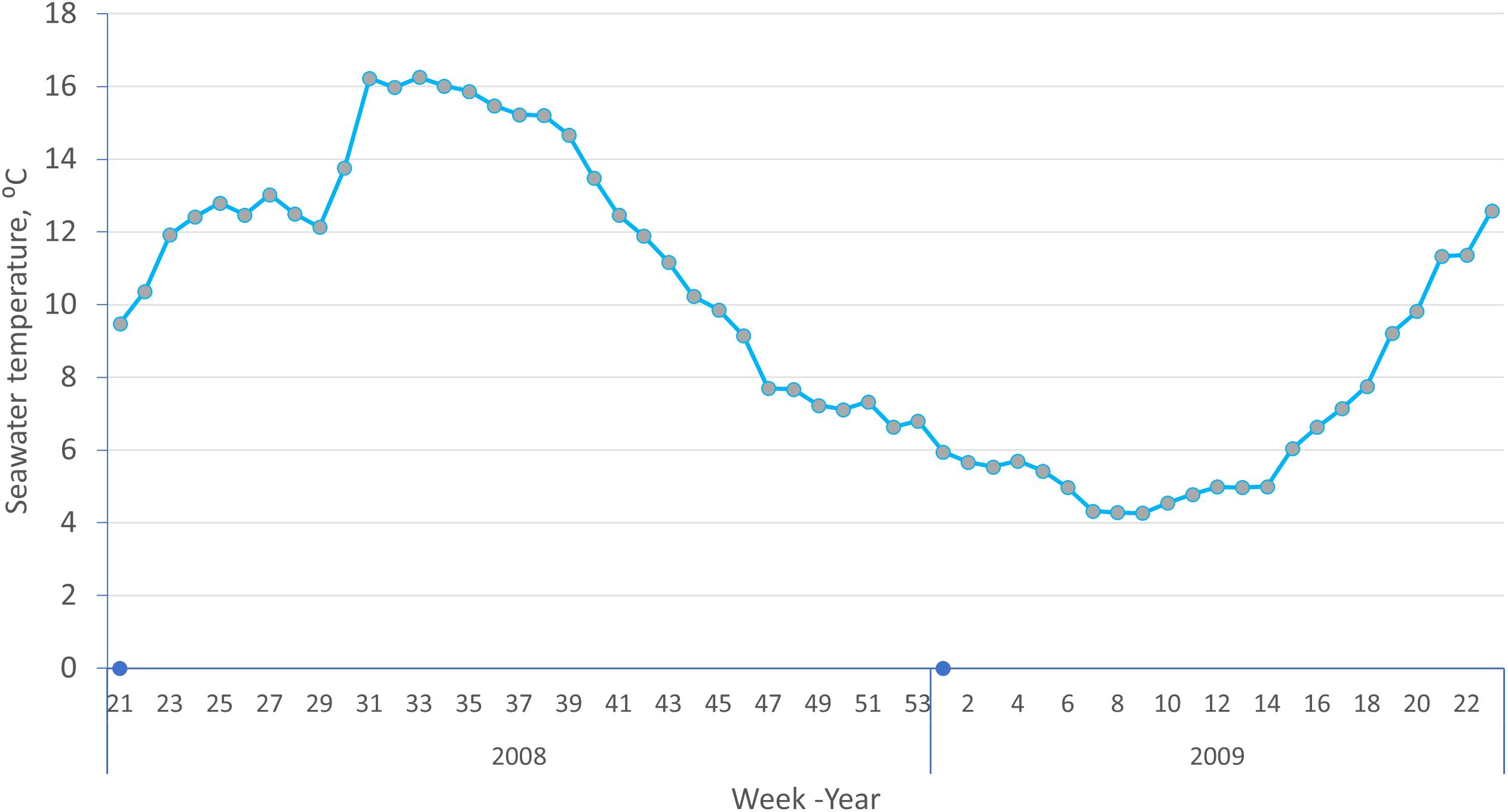At the November 2008 sampling, the biomass in the cage was ~15 kg/m3 (including approximately 1,800 fish mentioned above), and at the June 2009 slaughter, approximately 10 kg/m3, both well below the recommended biomass (<25 kg/m3) to secure the fish sufficient access to oxygen under the seawater current levels at the Averøy locality. The average weekly seawater temperature during the 12-month rearing period at Averøy is shown in Appendix 3.