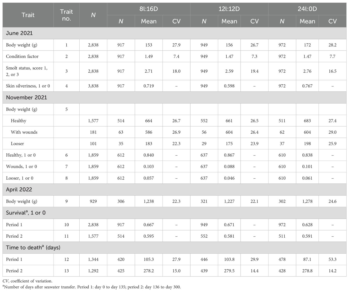 Methods: A total of 3,000 Atlantic salmon pre-smolts from 100 families were tagged with passive integrated transponders (PIT) and distributed across six tanks, with duplicated tanks exposed to a different light regime: 6 weeks on 8-hour light (L)/16-hour dark (D), 12L:12D, and 24L:0D, followed by 6 weeks on 24L:0D. One week prior to seawater transfer in June 2021, body weights and external smolt status were recorded. Body weights, wounds, and losses were recorded 135 days after seawater transfer in November 2021, and body weights were recorded again 300 days after seawater transfer in April 2022. A binary survival trait was defined for the seawater periods: Period 1 (day 0 to day 135) and Period 2 (day 136 to day 300), along with the time to death for the fish that were collected as dead.