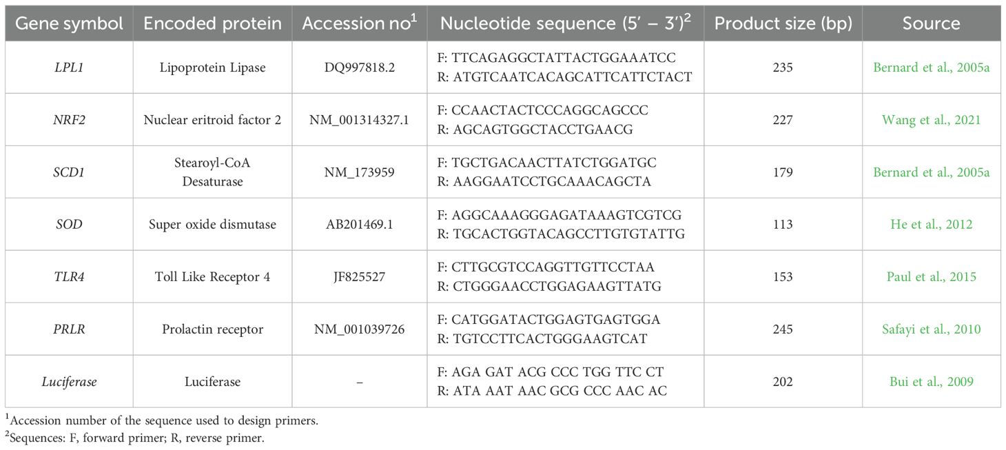 Reverse transcription (RT) was performed from 1 µg of total RNA by using High-Capacity RNA-to-cDNA™ Kit (Applied Biosystems) in a total volume of 20 µL, composed by 6 µL of RNA, 3 µL (2ng/µL) of Luciferase RNA Control (Promega) and 11 µL of Master Mix, according to the manufacturer’s instructions. The complementary DNA (cDNA) obtained was then stored at -20°C for RT-qPCR (Real Time qPCR). Samples of cDNA were finally subjected to RT-qPCR in duplicate with MicroAmp™ Fast Optical 96-Well Reaction Plates (Applied Biosystems) using Power SYBR™ Green PCR Master Mix (Applied Biosystems). The candidate genes (LPL1, NRF2, SCD1, SOD, TLR4, PRLR) were investigated and normalized by adopting Luciferase as reference gene (Jiwaji et al., 2010; Johnson et al., 2005). Each well was filled with 5 µL of cDNA (previously diluted 1:50 with nuclease free water) and 15 µL of Master Mix assembled by 10 µL of Mix SYBR, 2 µL of specific primers (1 µL Forward and 1 µL Reverse) and adjusted to volume of 15 µL with nuclease free water. RT-qPCR reaction was performed using 7300 Real-Time PCR System (Applied Biosystems) set up with the following program: denaturation at 95°C for 10 minutes; 40 cycles of PCR reactions at 95°C for 15 seconds and 60°C for 45 seconds according to the hybridization temperature. The samples were run in duplicate and compared to reference gene to obtain ΔCt (Terzi et al., 2004). Primers were specifically designed on goat reference mRNA sequences and were purchased by Merck (Sigma-Aldrich). Gene primers are reported in Table 1.