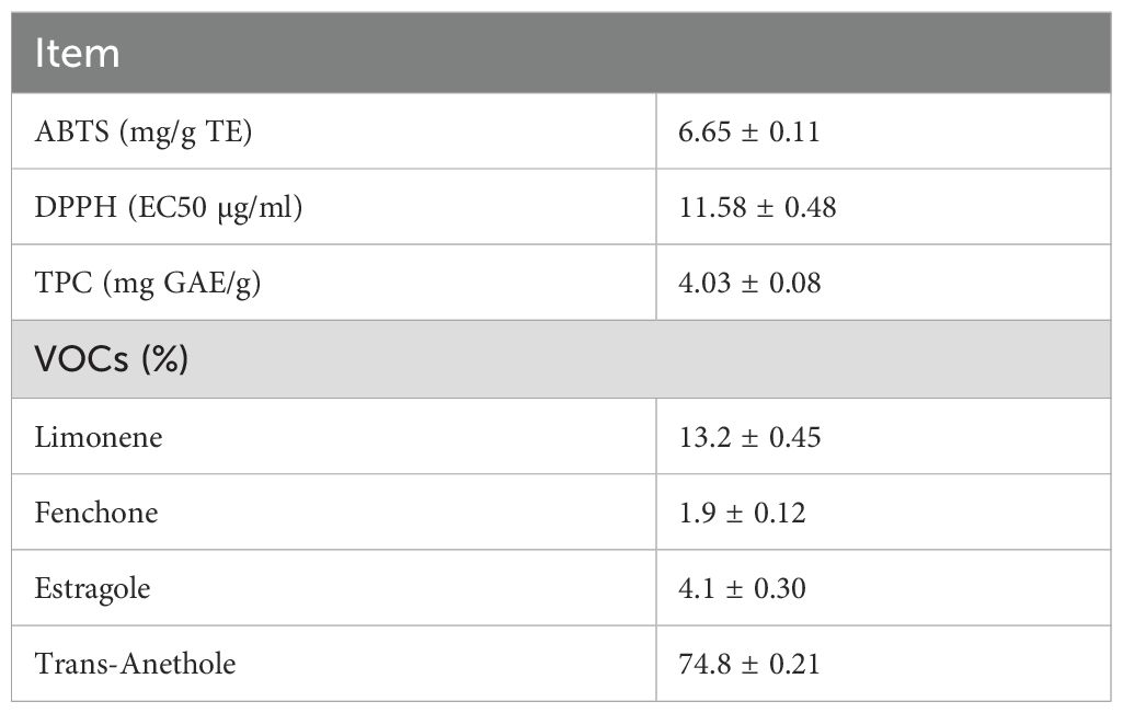 To improve production efficiency, optimize animal health and address sustainability concerns, researchers and farmers are increasingly turning to nutraceuticals. These bioactive compounds derived from natural sources offer potential health benefits (Losacco et al., 2025). They serve as alternative feed additives and positively influence the immune system through antioxidant, anti-inflammatory and antimicrobial effects (Iommelli et al., 2025a) having as a result improved animal health and productivity. Fennel (Foeniculum vulgare Mill) is an aromatic plant belonging to the Apiaceae family, traditionally used in human health care for its medicinal properties (Badgujar et al., 2014). It is valued for its carminative, digestive and diuretic properties (Rather et al., 2016). Its major bioactive components include phenolic compounds, glycosides and volatile organic compounds (VOCs), with trans-anethole, estragole, limonene and fenchone being the most abundant.