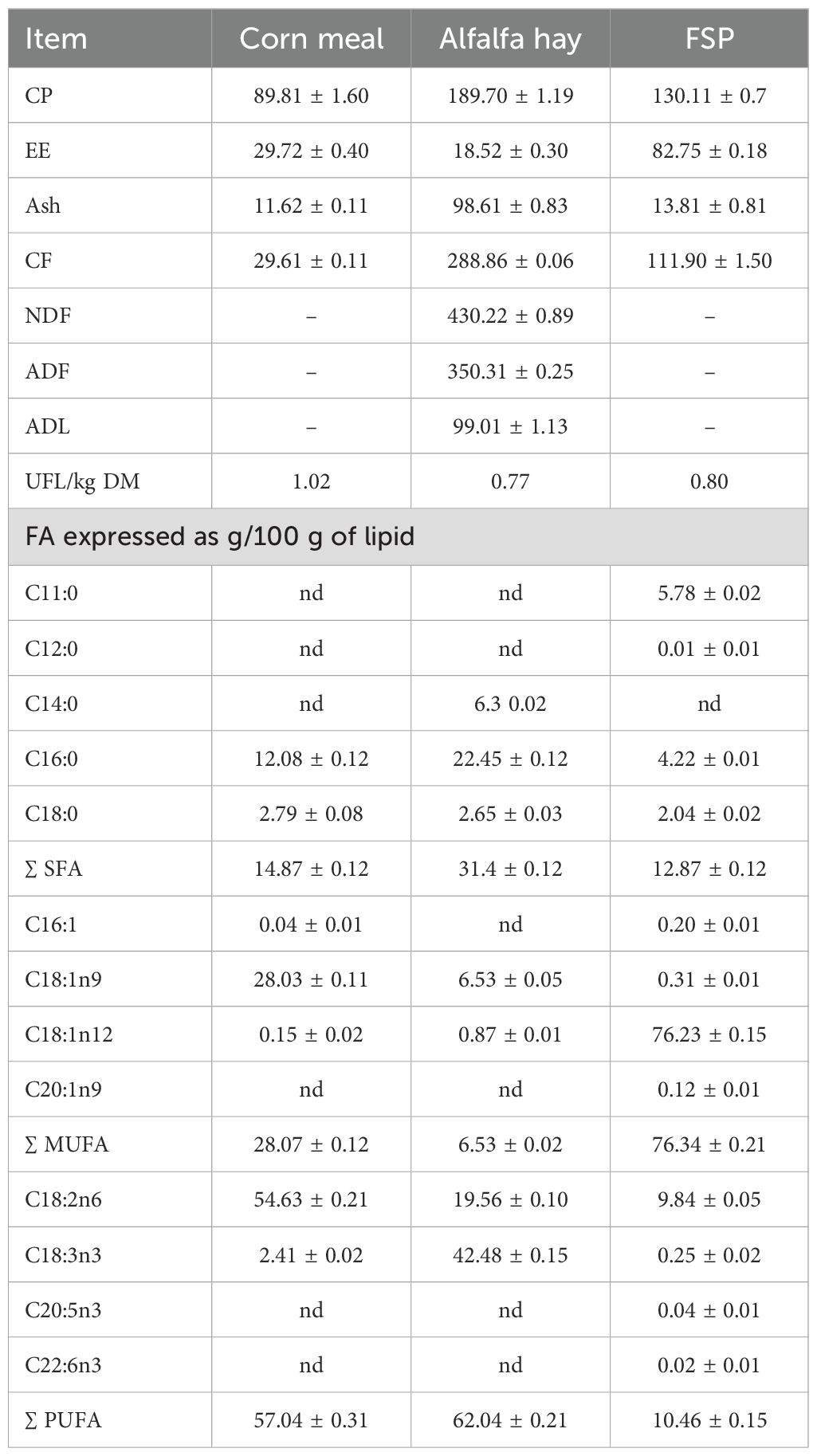 Corn meal, fennel seeds and alfalfa hay were analyzed for dry matter (DM), crude protein (CP), ash, crude fiber (CF) and ether extract (EE) contents, according to AOAC (2012) procedures, and structural carbohydrates were determined as suggested by Van Soest et al. (1991). Feed nutritional value was calculated according to Inra–Nozière et al. (2018).