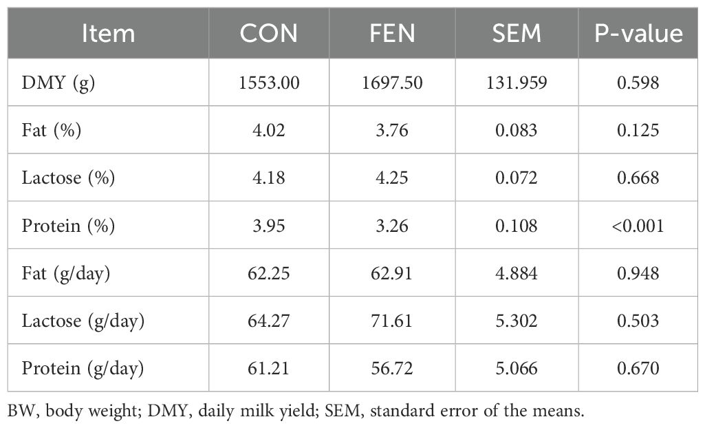 In Table 4 MY and chemical composition are presented. No feed refusal were detected; therefore, the dry matter intake (DMI) was 1460 g/head/day. Group FEN had higher MY even if it was not statistically significant (P > 0.05). No differences were observed for fat and lactose content whereas protein content resulted significantly lower in the supplemented group (P < 0.05). Fat, lactose and protein yield were also measured as g/day and were not affected by the treatment (P > 0.05).