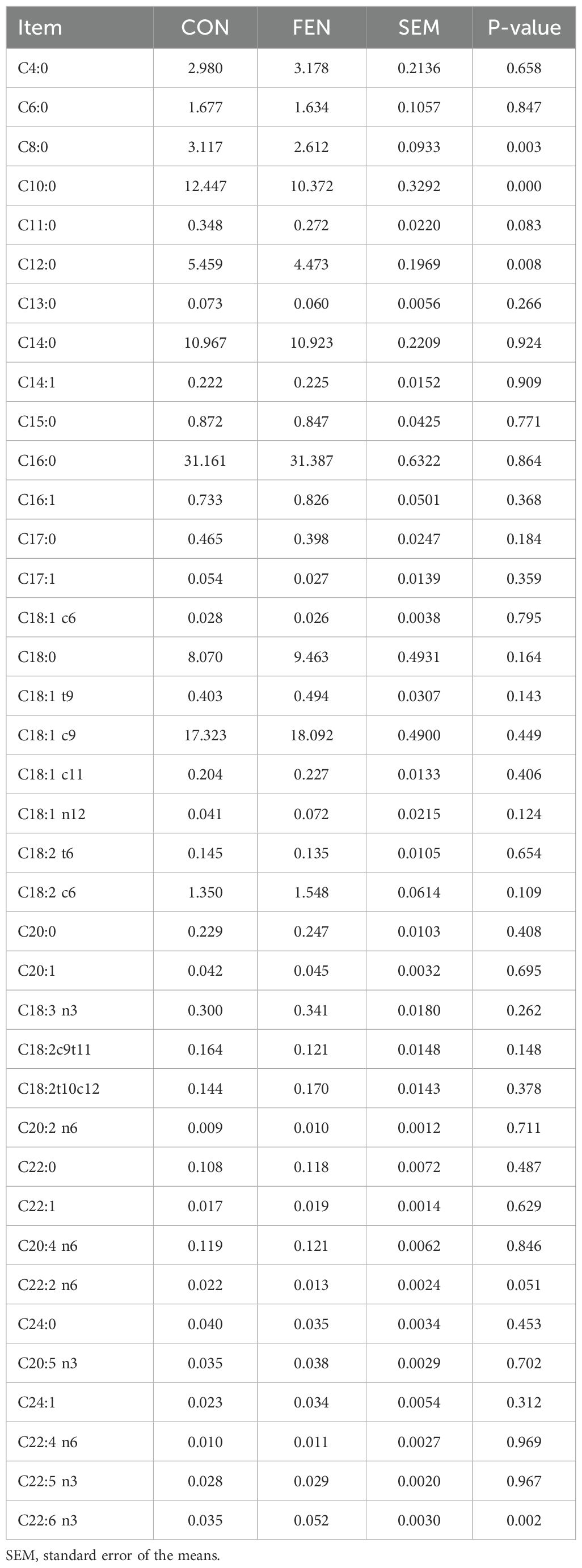 Milk FA profile of the two groups is reported in Table 5. Only few differences were detected between groups. Specifically, among short chain FA, C8:0, C10:0 and C12:0 resulted significantly lower (P < 0.05) in group treated and regarding long chain FA only C22:6 differed between groups, being higher (P < 0.05) in group FEN.