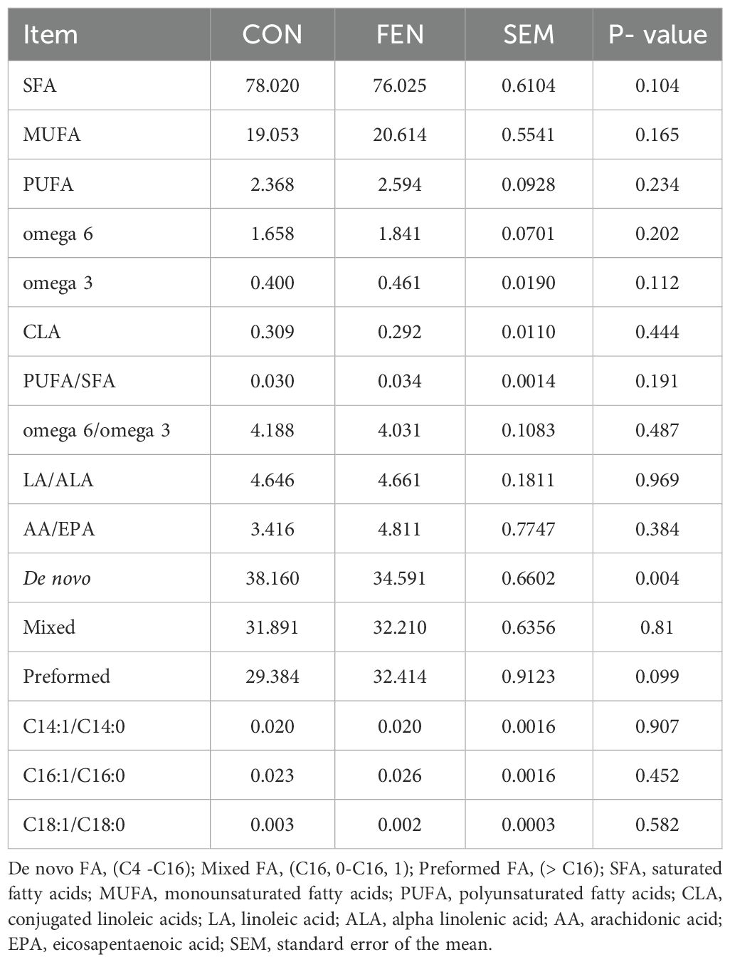 In Table 6 the main FA classes, ratios and indices are depicted. No differences were detected between groups for saturated fatty acids (SFA), monounsaturated fatty acids (MUFA) and PUFA content whereas de novo FA (C4:0 to C16:0) resulted significantly lower in group FEN.