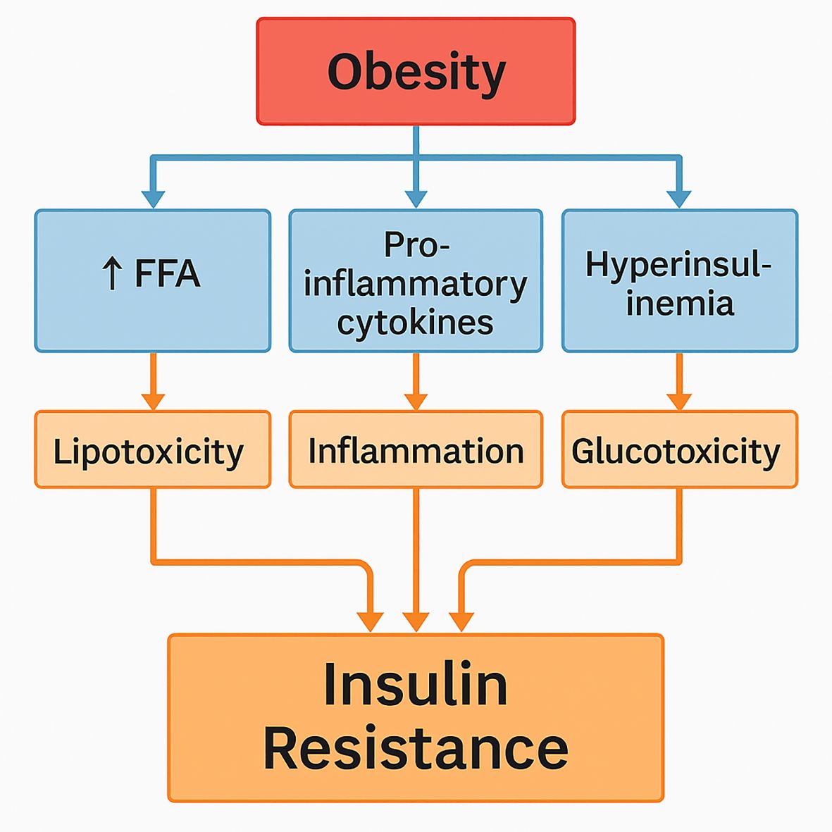 These metabolic abnormalities point to a general decrease in glucose tolerance, which accelerates the development of type 2 diabetes. Inflammation connected to obesity disrupts insulin signaling and raises oxidative stress in tissues. High reactive oxygen species (ROS) damaging insulin signaling pathways can help to build a feedback loop maintaining metabolic inefficiency and insulin resistance (Clark and Hoenig, 2021; Zagayko et al., 2019).