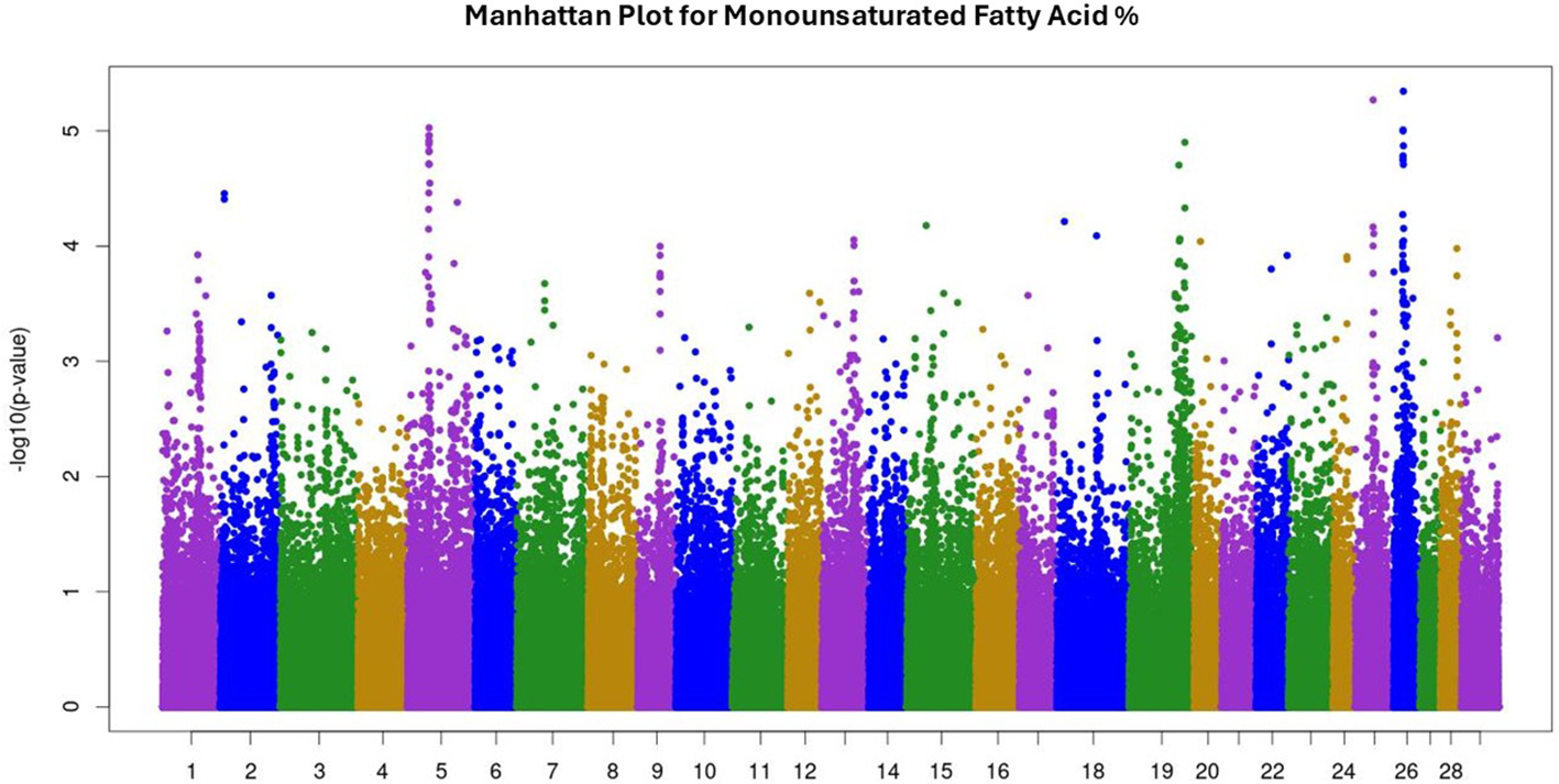 Manhattan plot for monounsaturated fatty acid percentage. The Manhattan plot illustrates single nucleotide polymorphisms (SNP) p-values for trait analysis across all 29 autosomal chromosomes. The x-axis lists chromosome numbers, and the y-axis shows the negative log of the p-values, indicating the level of significance. Peaks suggest associations with the trait under study.