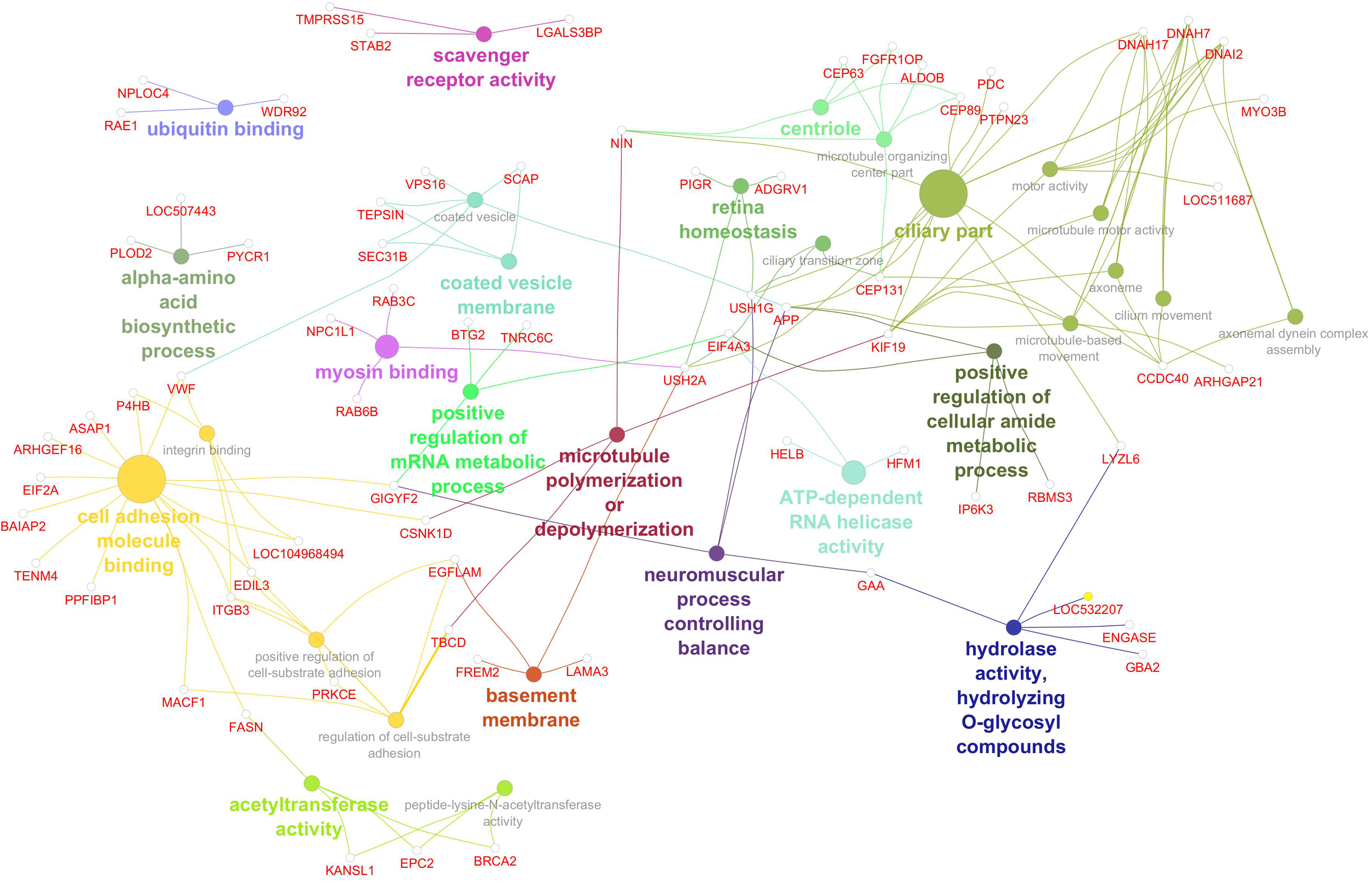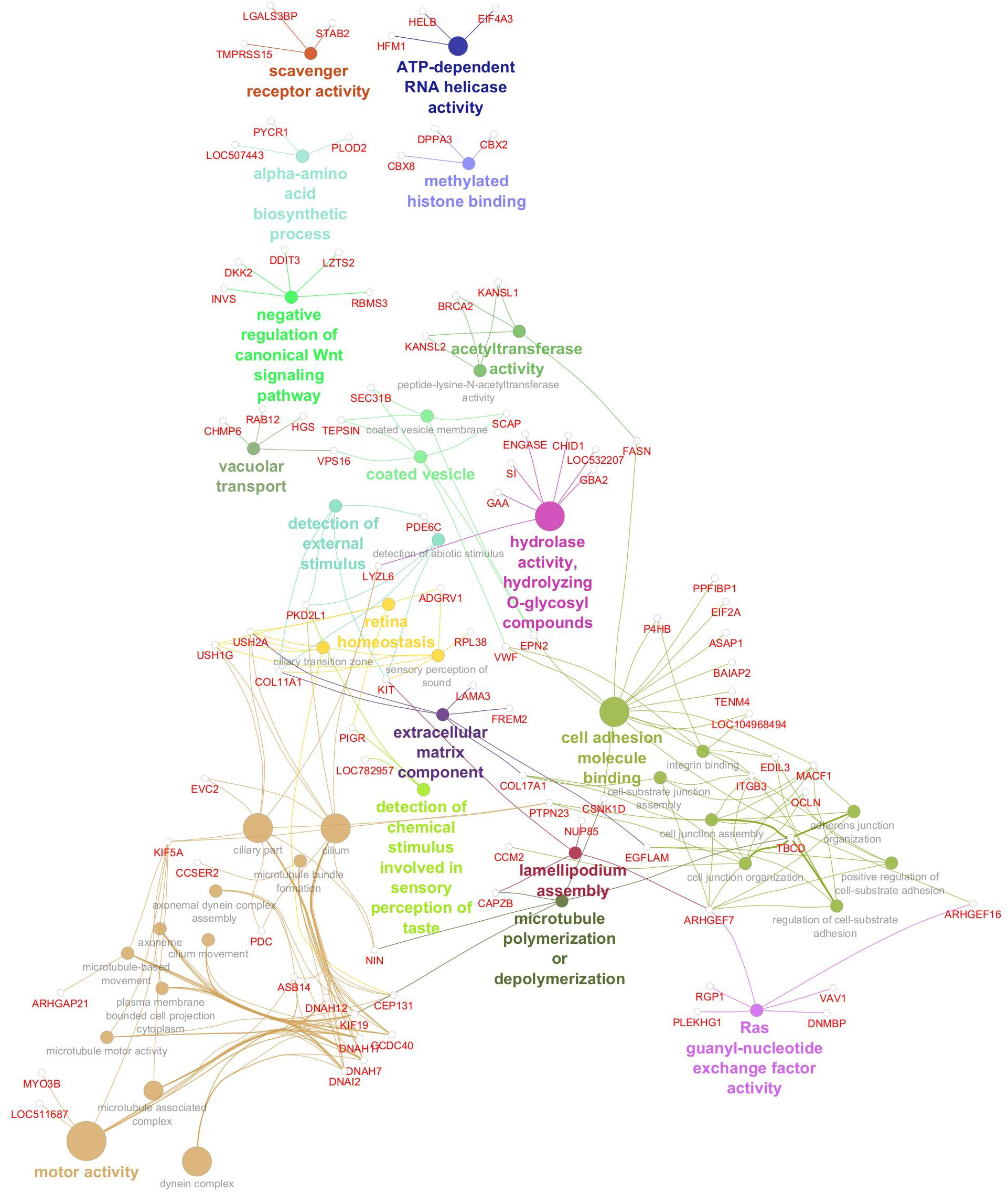 Gene network for Marbling. Network diagram illustrating various biological processes and activities with linked nodes representing genes and gene functions. Different colors and paths highlight relationships between processes, suggesting complex interactions.